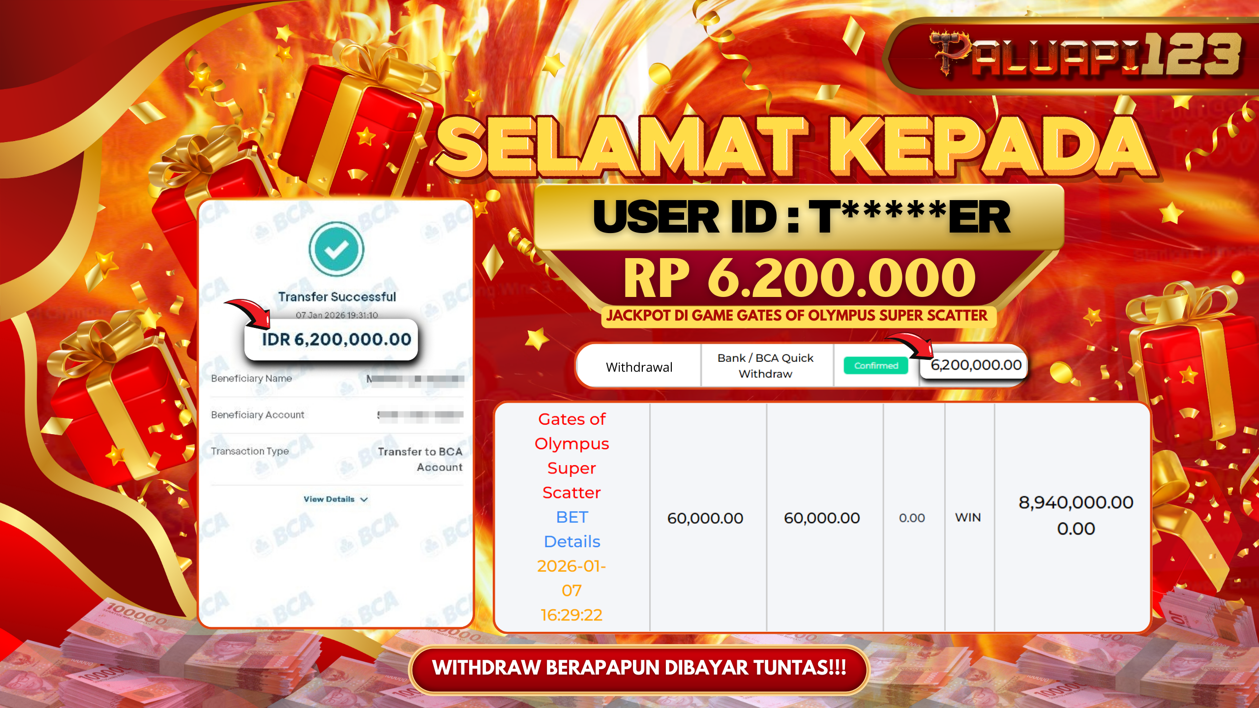 Selamat kepada User id : T*****ER Telah berhasil mendapatkan kemenangan besar pada permainan GATES OF OLYMPUS SUPER SCATTER kemenangan Sebesar Rp.6.200.000.,-