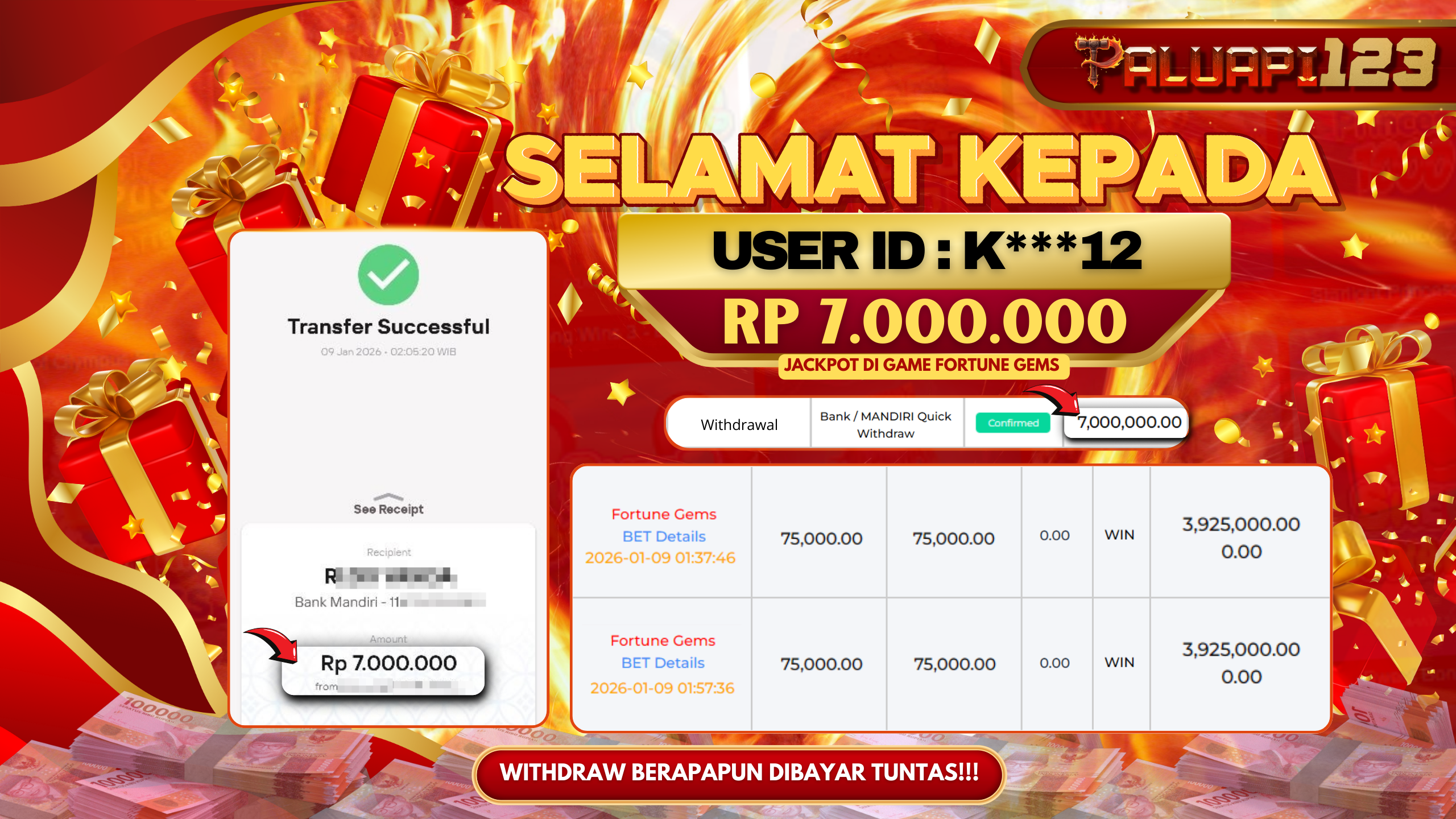 Selamat kepada User id : K***12 Telah berhasil mendapatkan kemenangan besar pada permainan FORTUNE GEMS kemenangan Sebesar Rp.7.000.000.,-