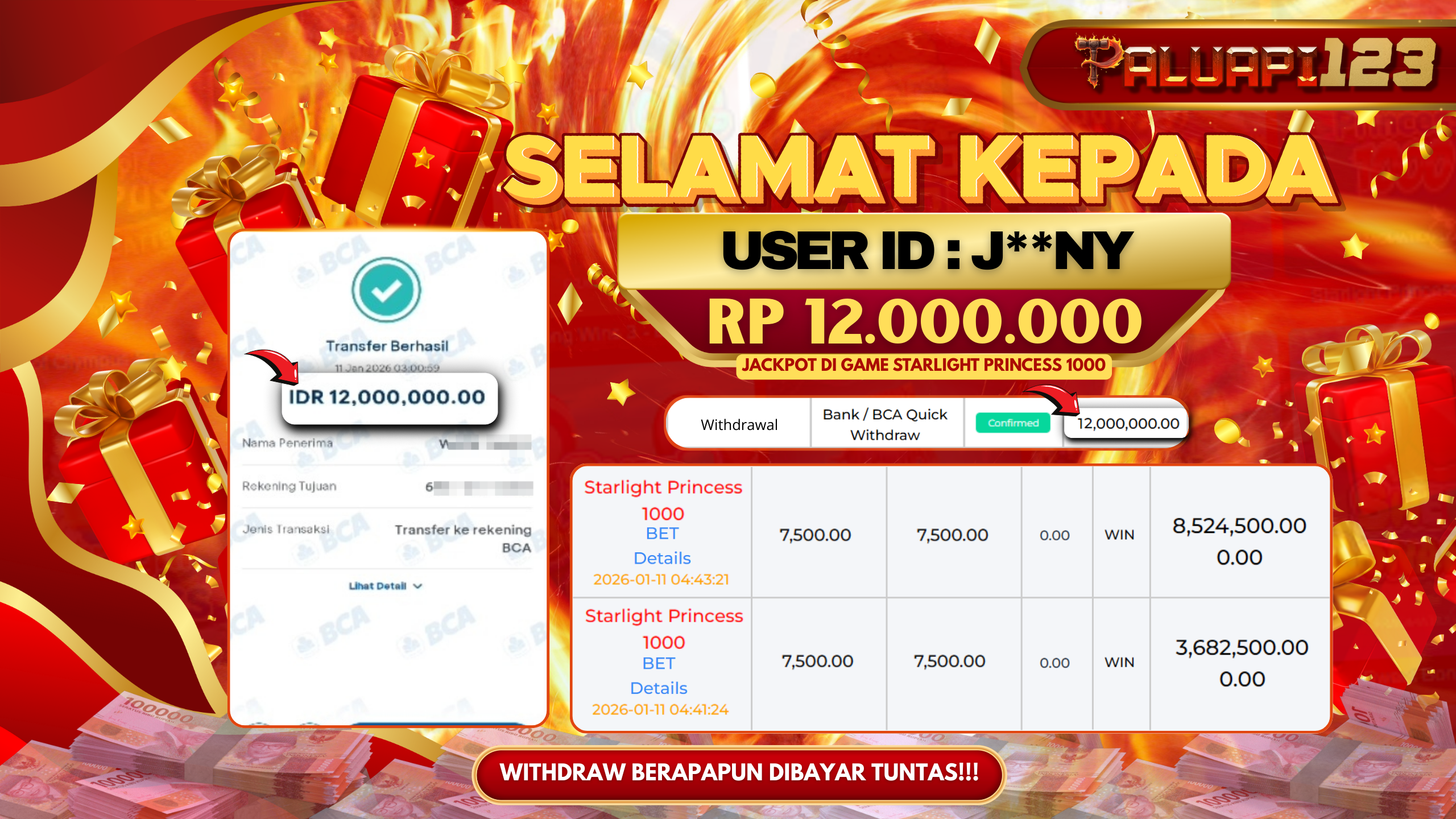 Selamat kepada User id : J**NY Telah berhasil mendapatkan kemenangan besar pada permainan STARLIGHT PRINCESS 1000 kemenangan Sebesar Rp.12.000.000.,-
