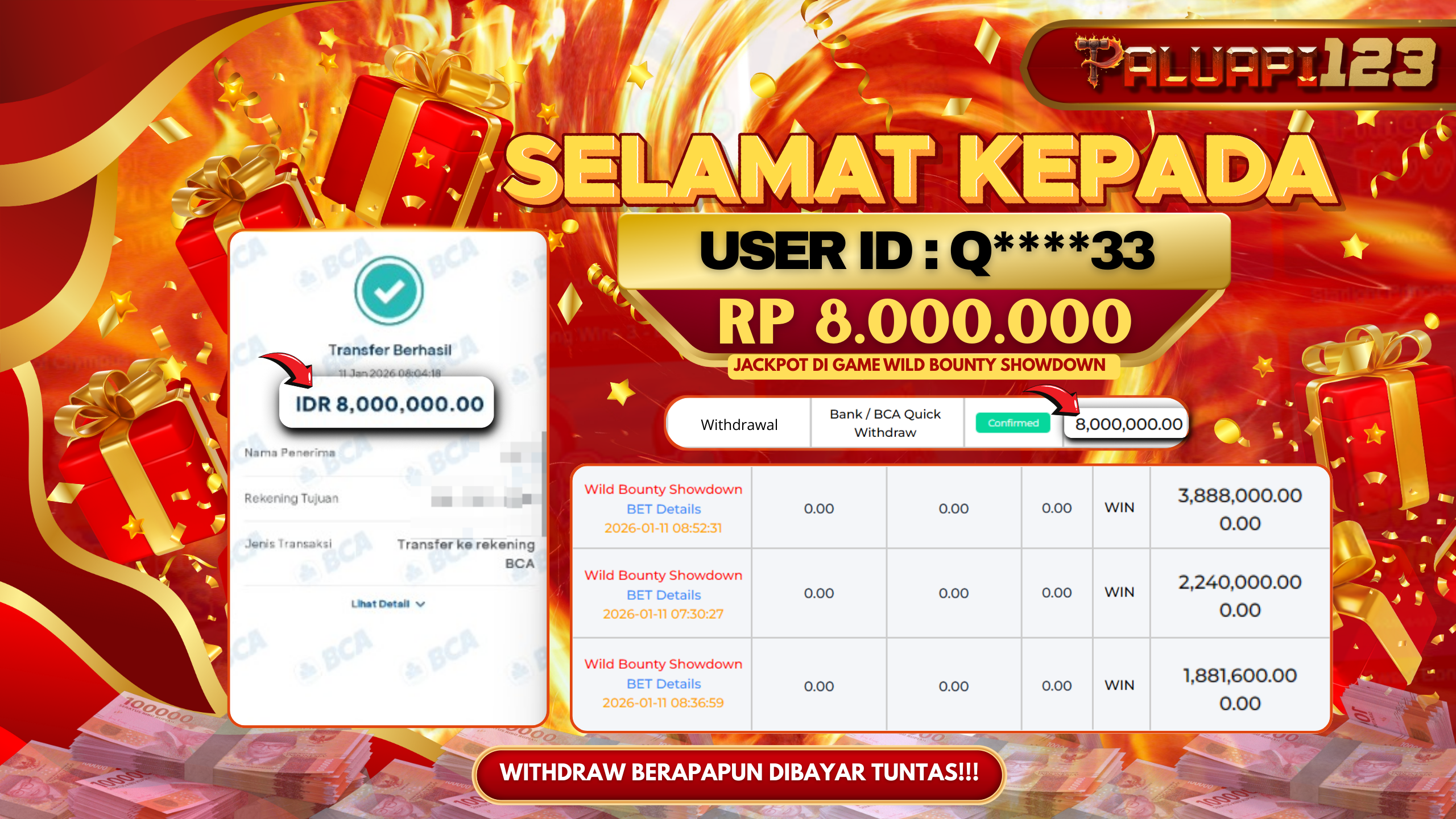 Selamat kepada User id : Q****33 Telah berhasil mendapatkan kemenangan besar pada permainan WILD BOUNTY SHOWDOWN kemenangan Sebesar Rp.8.000.000.,-