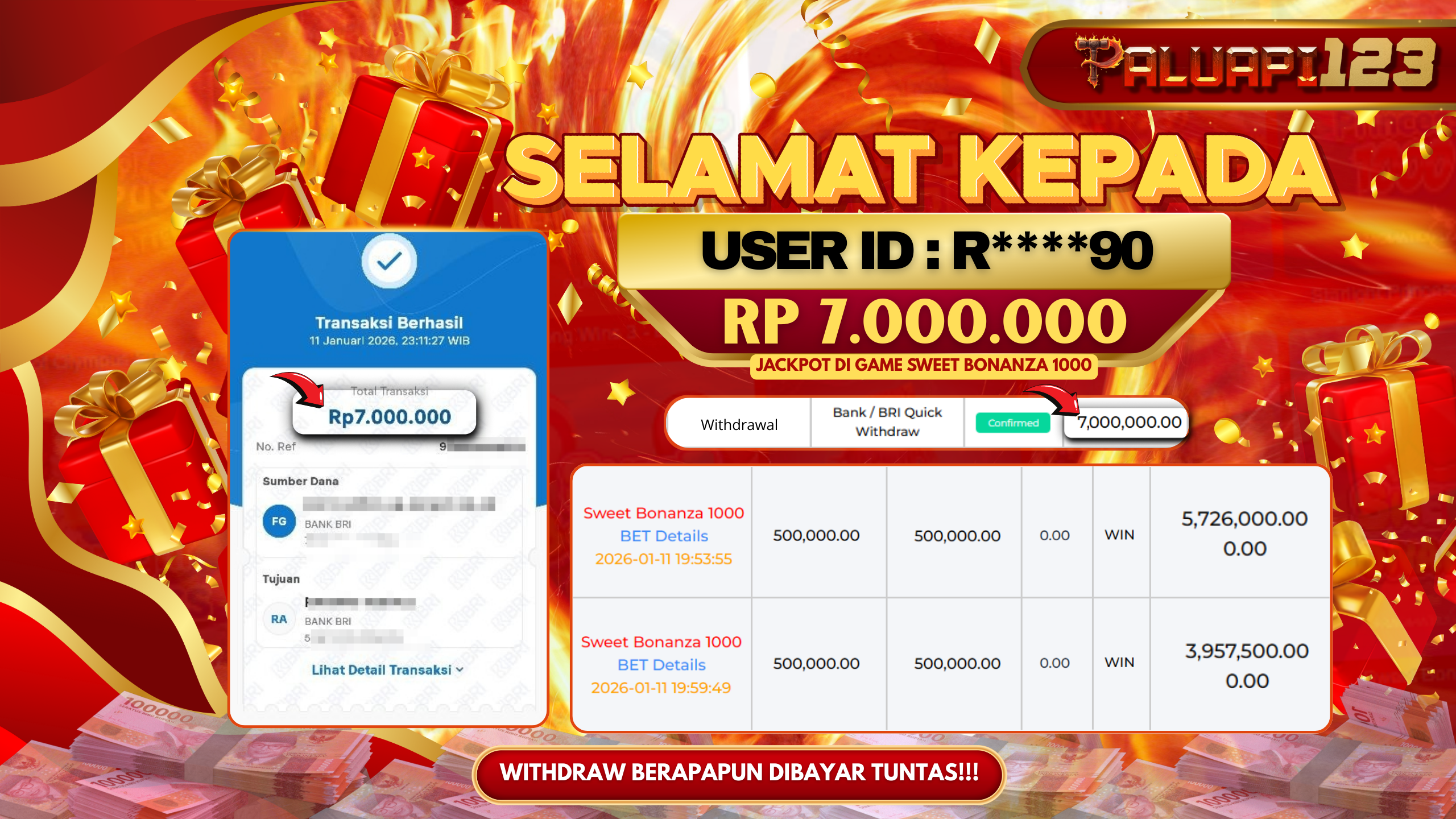 Selamat kepada User id : R****90 Telah berhasil mendapatkan kemenangan besar pada permainan SWEET BONANZA 1000 kemenangan Sebesar Rp.7.000.000.,-