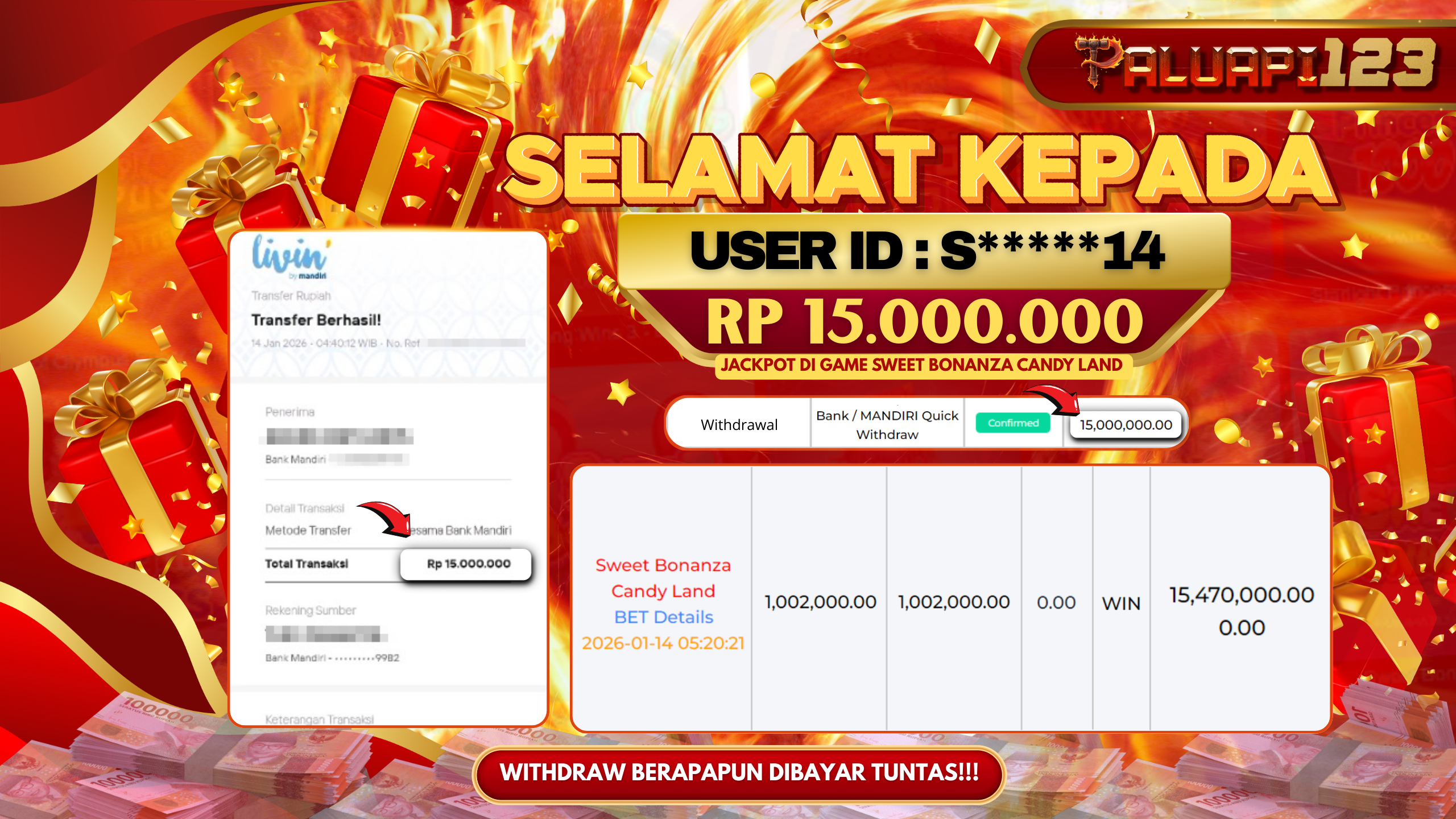 Selamat kepada User id : S*****14 Telah berhasil mendapatkan kemenangan besar pada permainan SWEET BONANZA CANDY LAND kemenangan Sebesar Rp.15.000.000.,-
