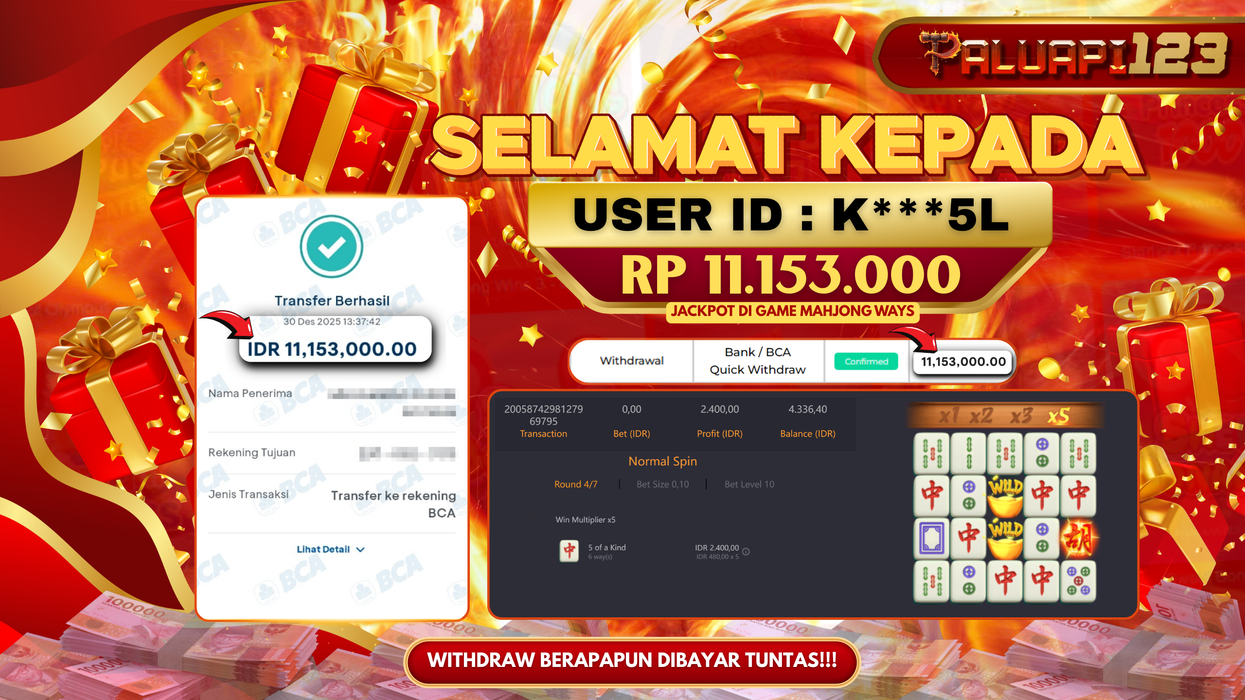 Selamat kepada User id : K***5L Telah berhasil mendapatkan kemenangan besar pada permainan MAHJONG WAYS kemenangan Sebesar Rp.11.153.000.,-