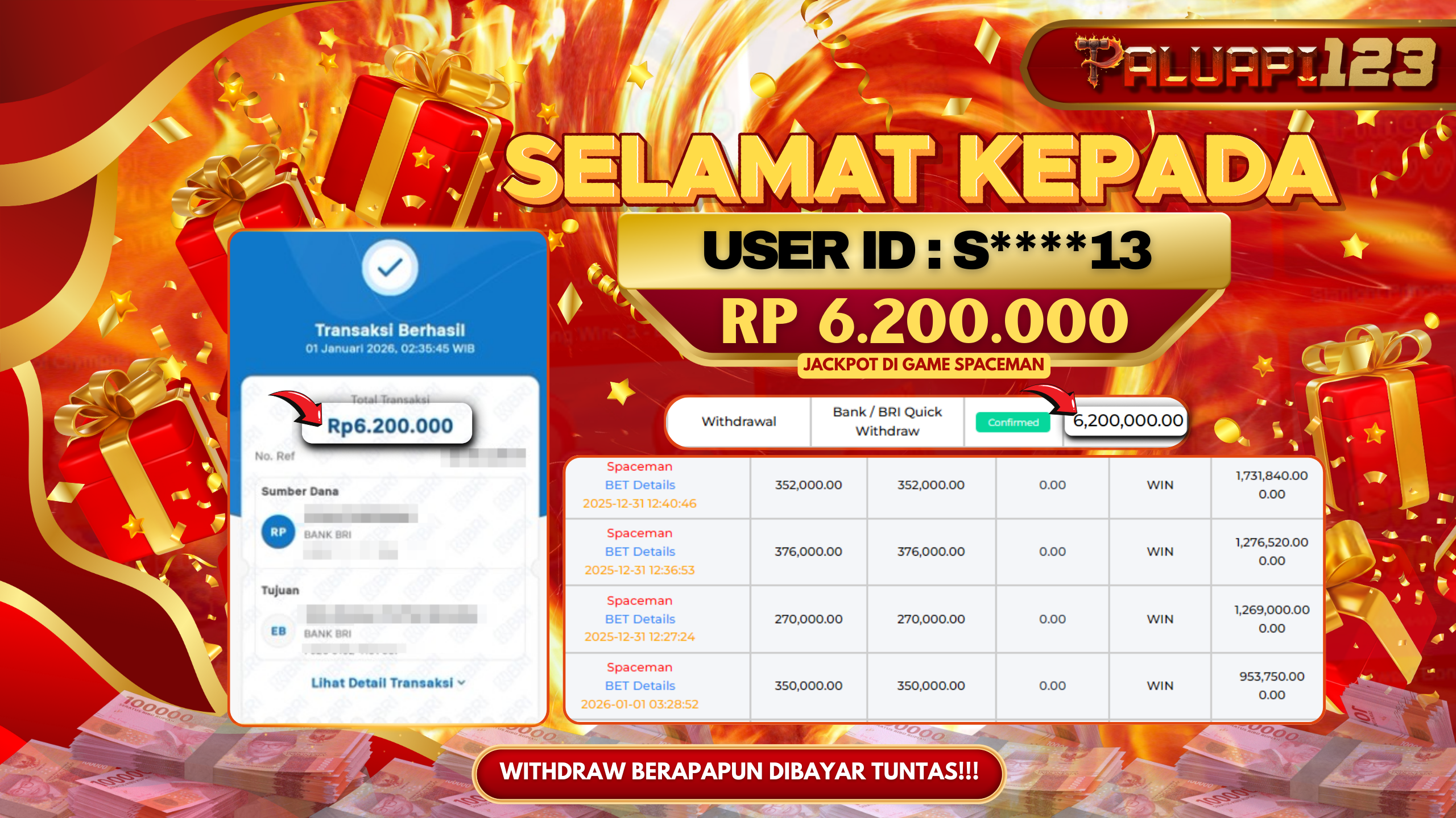 Selamat kepada User id : S****13 Telah berhasil mendapatkan kemenangan besar pada permainan SPACEMAN kemenangan Sebesar Rp.6.200.000.,-