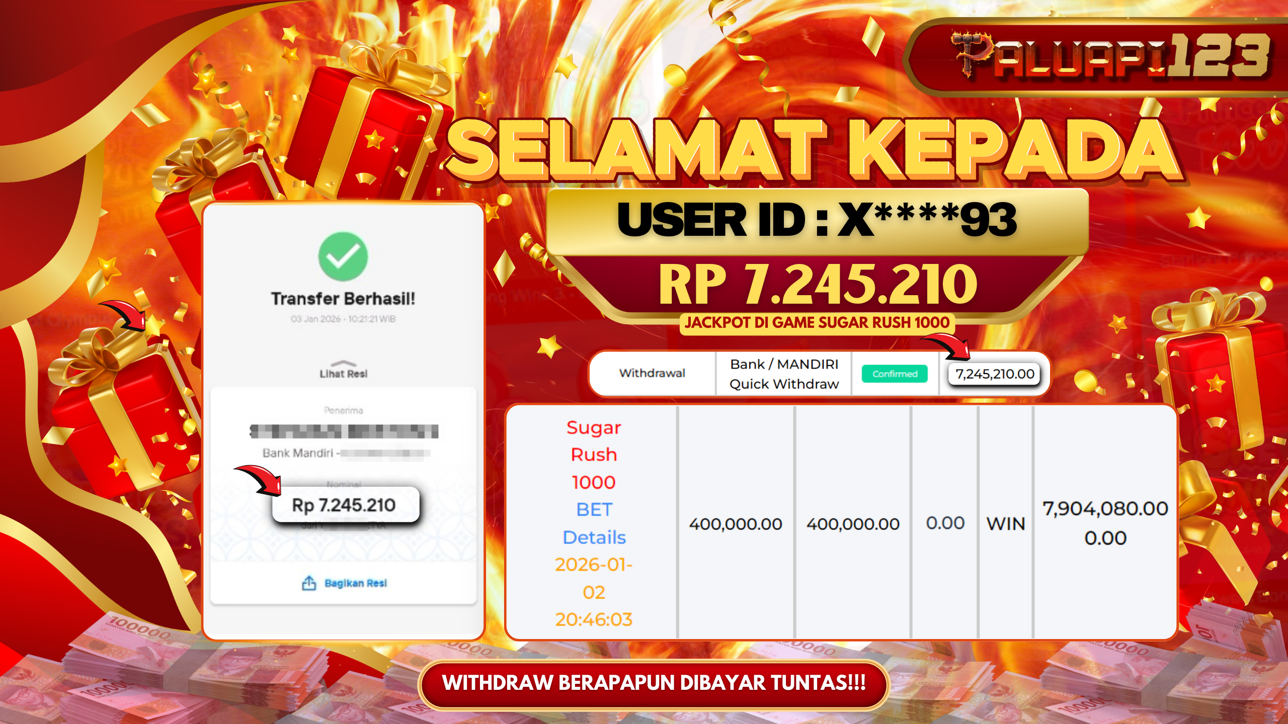 Selamat kepada User id : X****93 Telah berhasil mendapatkan kemenangan besar pada permainan SUGAR RUSH 1000 kemenangan Sebesar Rp.7.245.210.,-