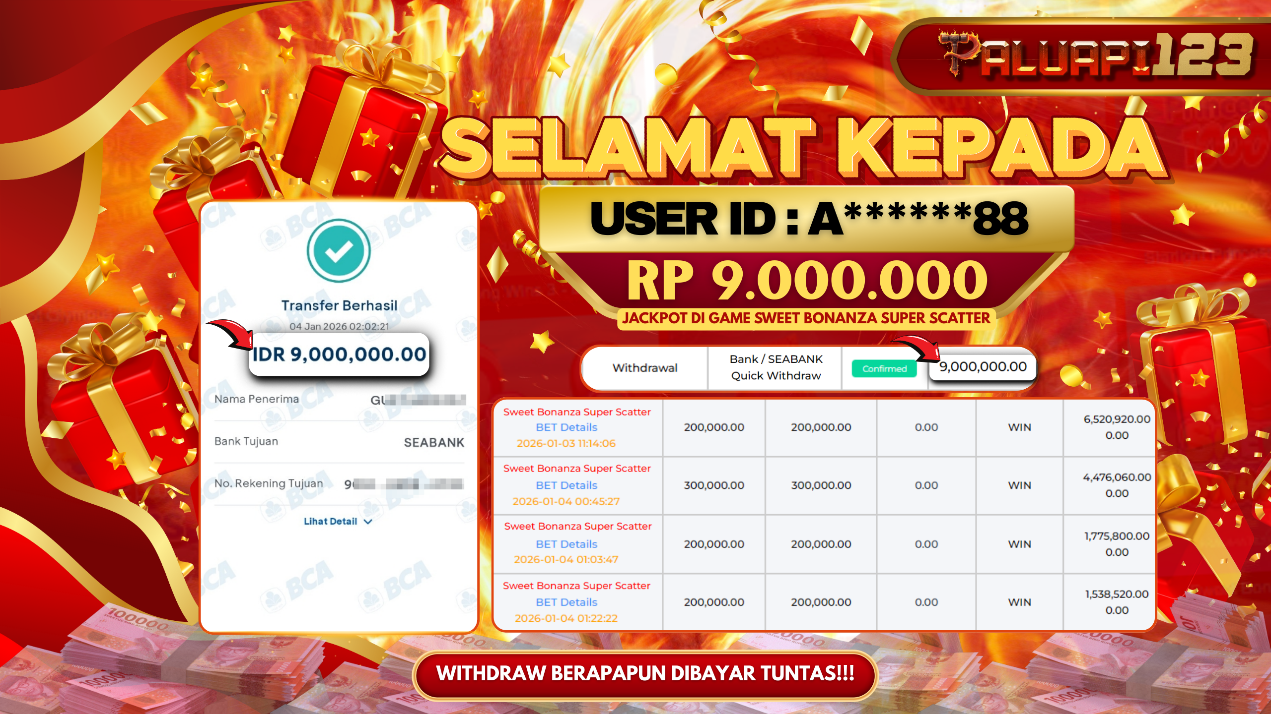Selamat kepada User id : A******88 Telah berhasil mendapatkan kemenangan besar pada permainan SWEET BONANZA SUPER SCATTER kemenangan Sebesar Rp.9.000.000.,-