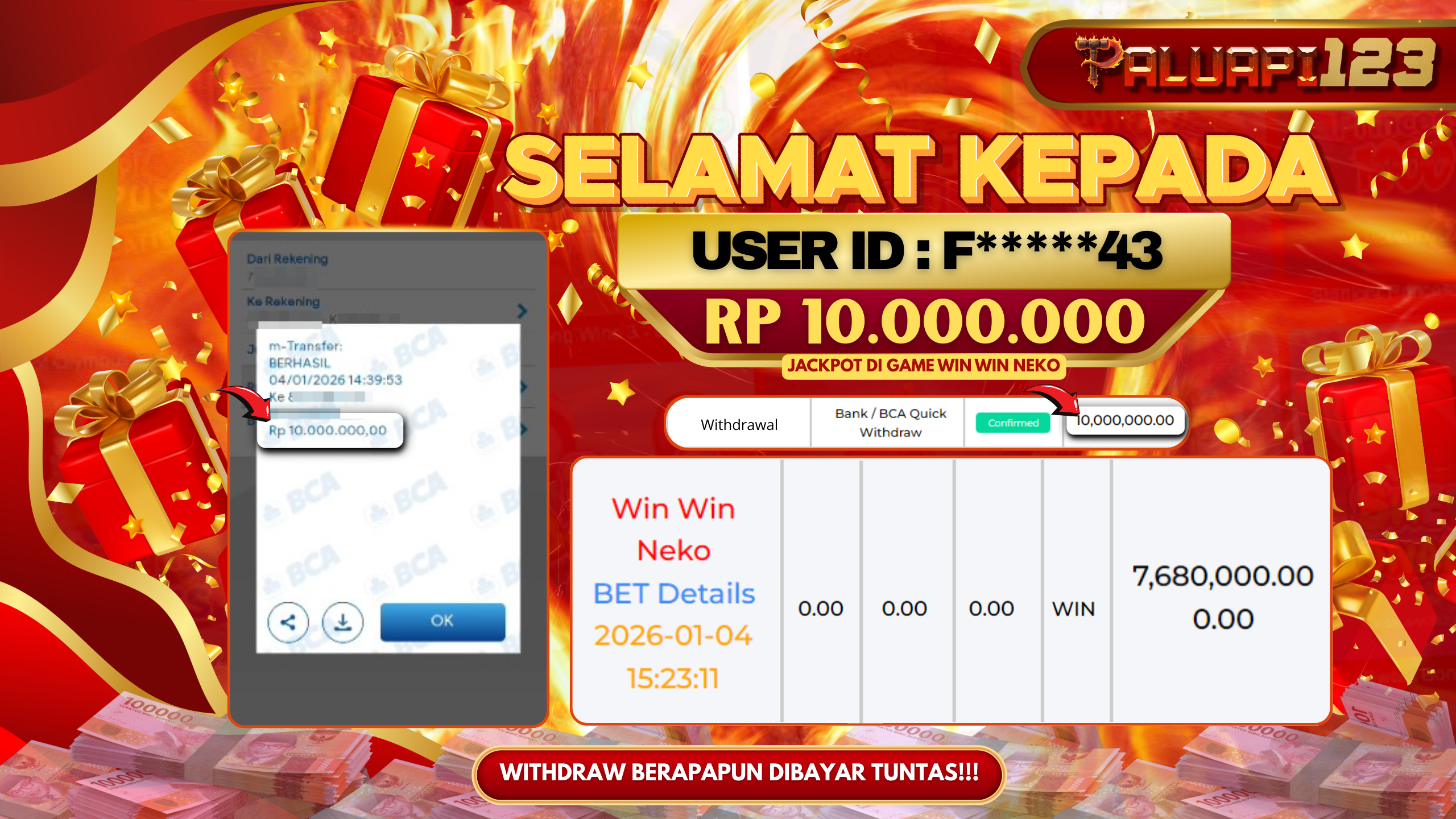 Selamat kepada User id : F*****43 Telah berhasil mendapatkan kemenangan besar pada permainan WIN WIN NEKO kemenangan Sebesar Rp.10.000.000.,-
