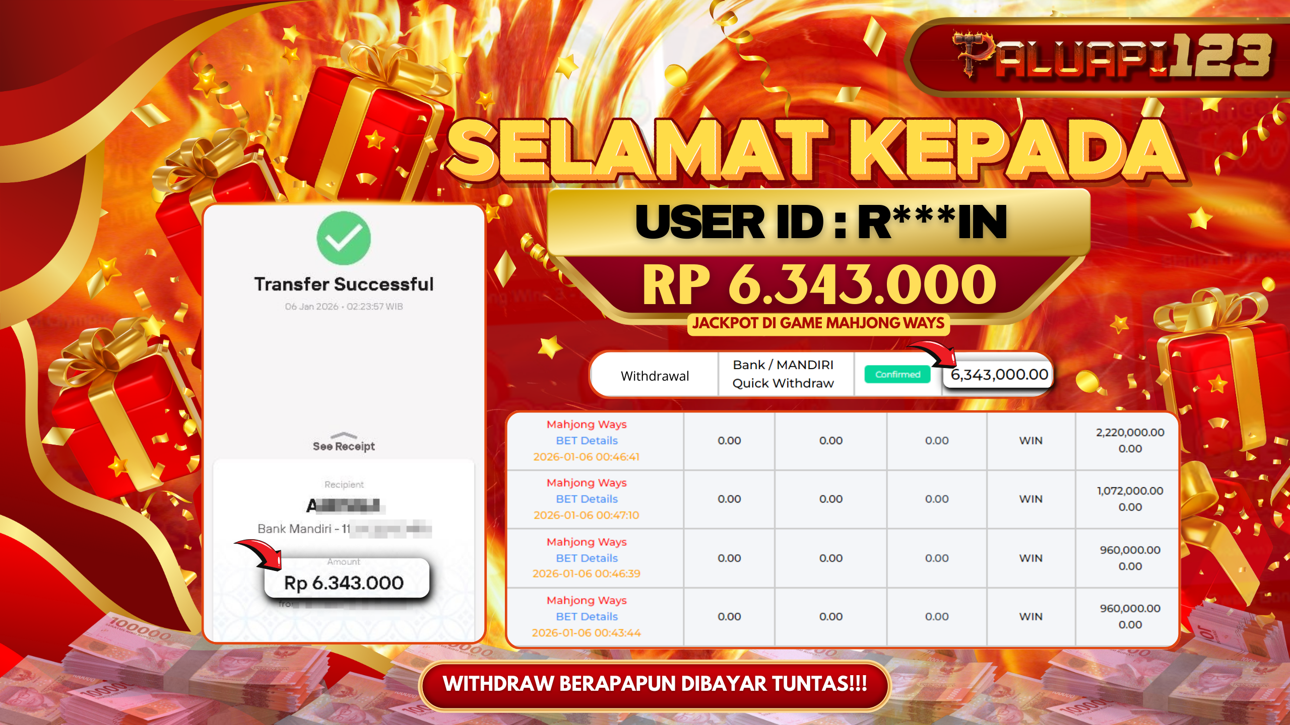Selamat kepada User id : R***IN Telah berhasil mendapatkan kemenangan besar pada permainan MAHJONG WAYS kemenangan Sebesar Rp.6.343.000.,-