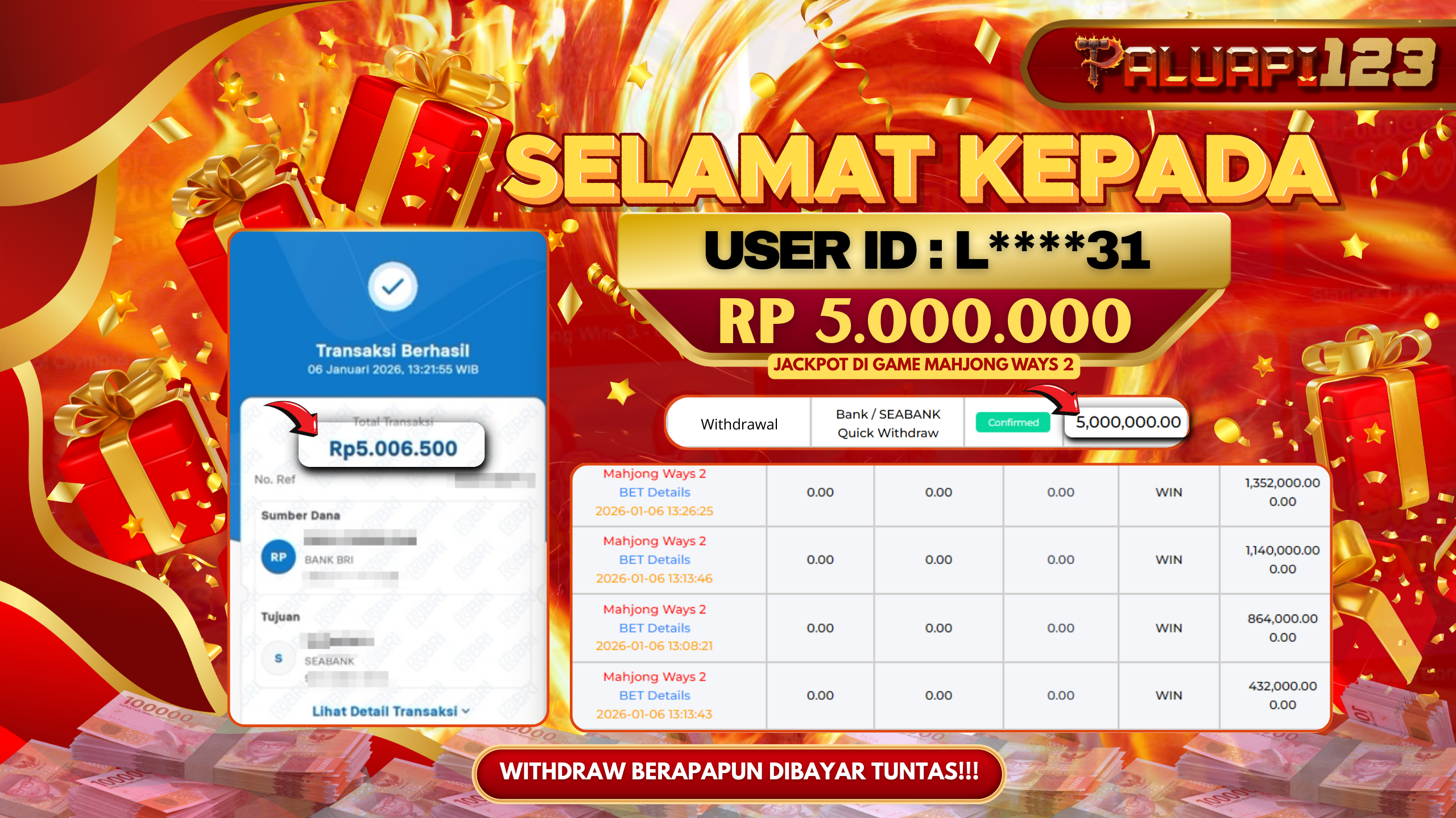 Selamat kepada User id : L****31 Telah berhasil mendapatkan kemenangan besar pada permainan MAHJONG WAYS 2 kemenangan Sebesar Rp.5.000.000.,-