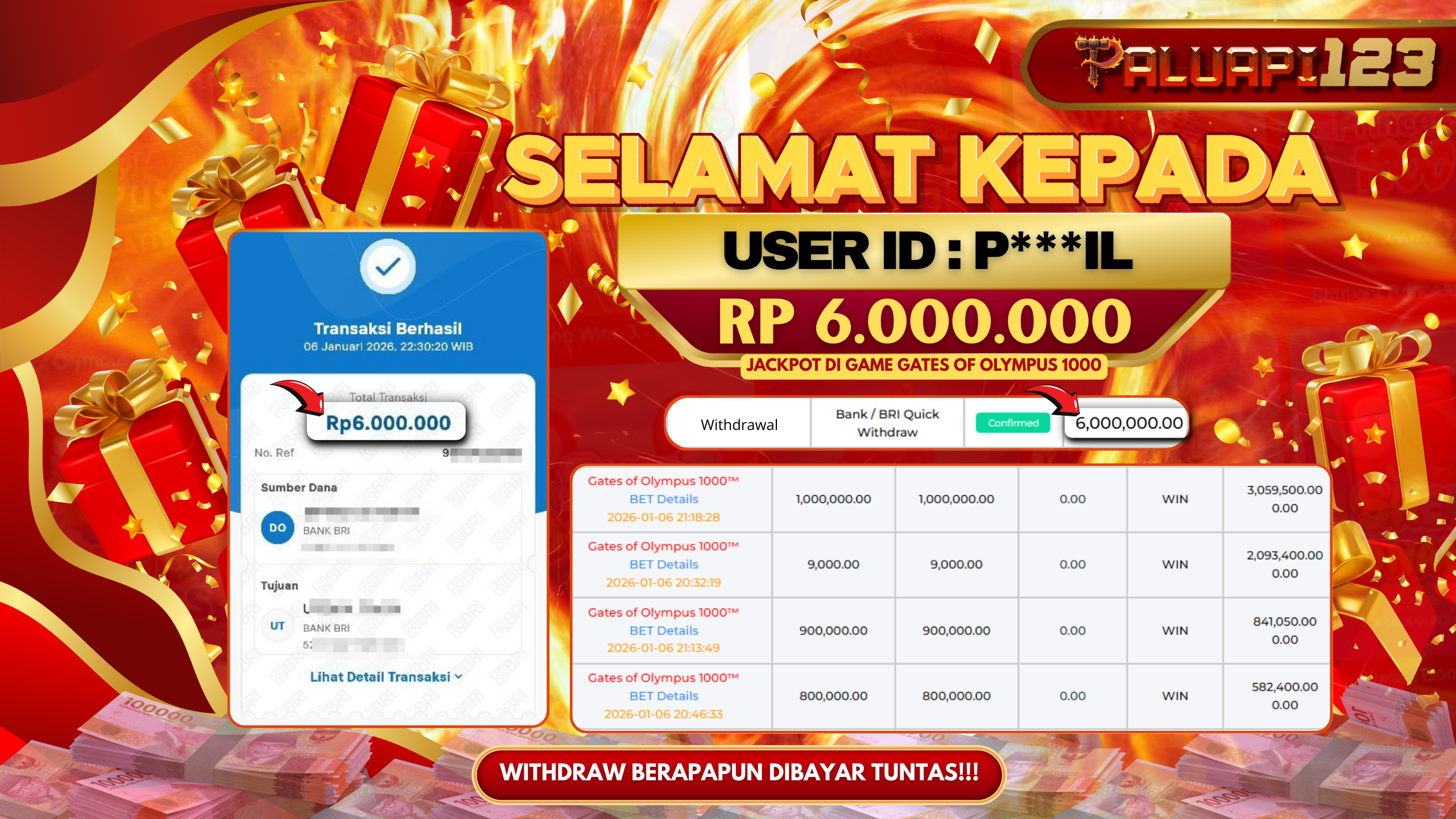 Selamat kepada User id : P***IL Telah berhasil mendapatkan kemenangan besar pada permainan GATES OF OLYMPUS 1000 kemenangan Sebesar Rp.6.000.000.,-