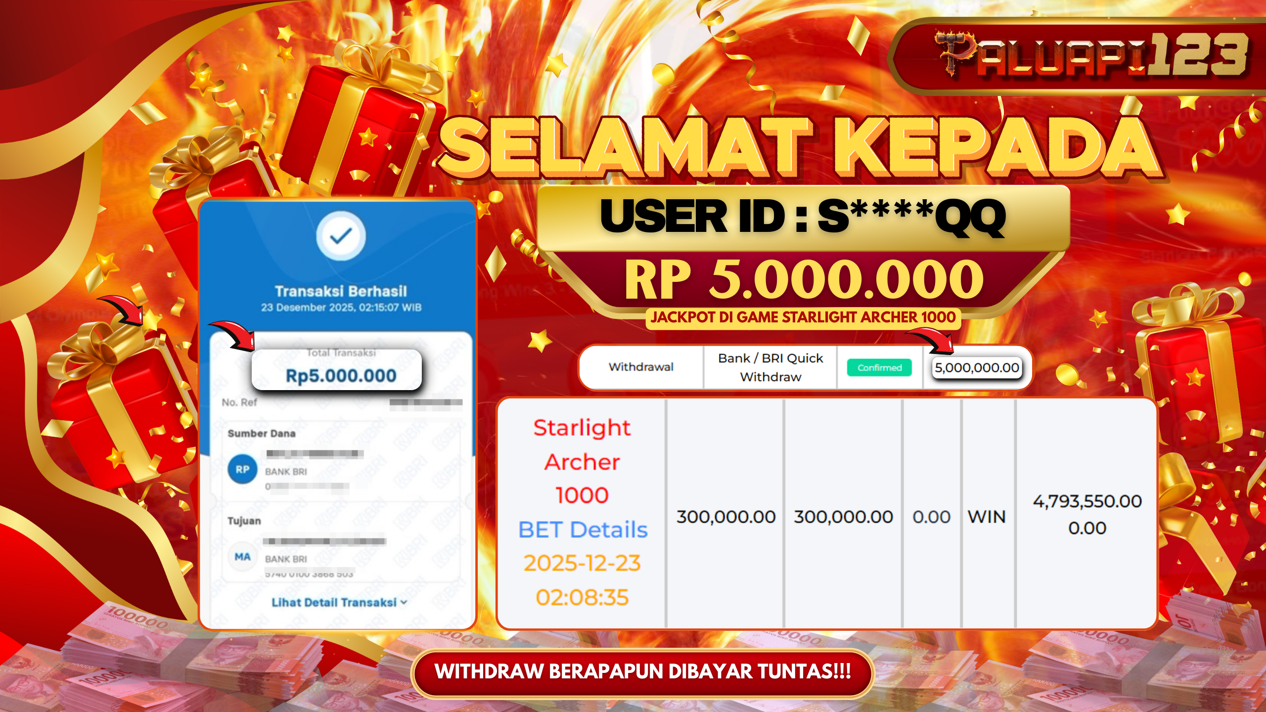 Selamat kepada User id : S****QQ Telah berhasil mendapatkan kemenangan besar pada permainan STARLIGHT ARCHER 1000 kemenangan Sebesar Rp.5.000.000.,-