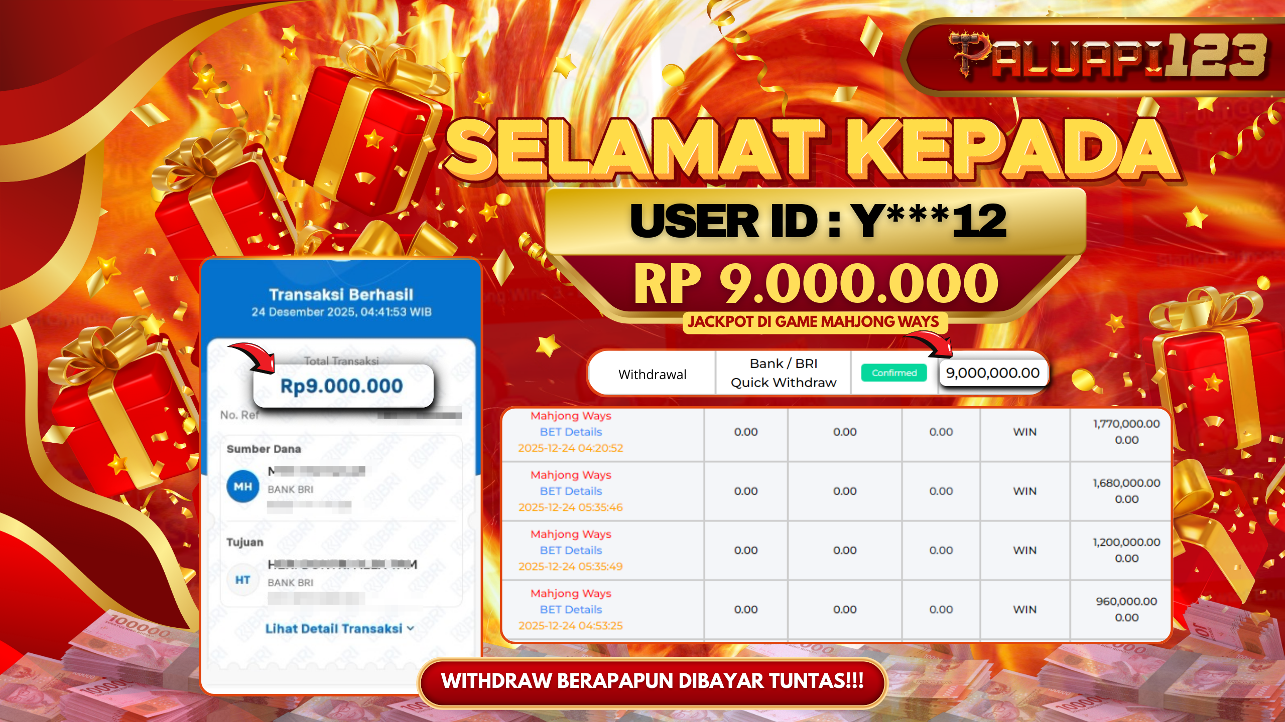 Selamat kepada User id : Y***12 Telah berhasil mendapatkan kemenangan besar pada permainan MAHJONG WAYS kemenangan Sebesar Rp.9.000.000.,-