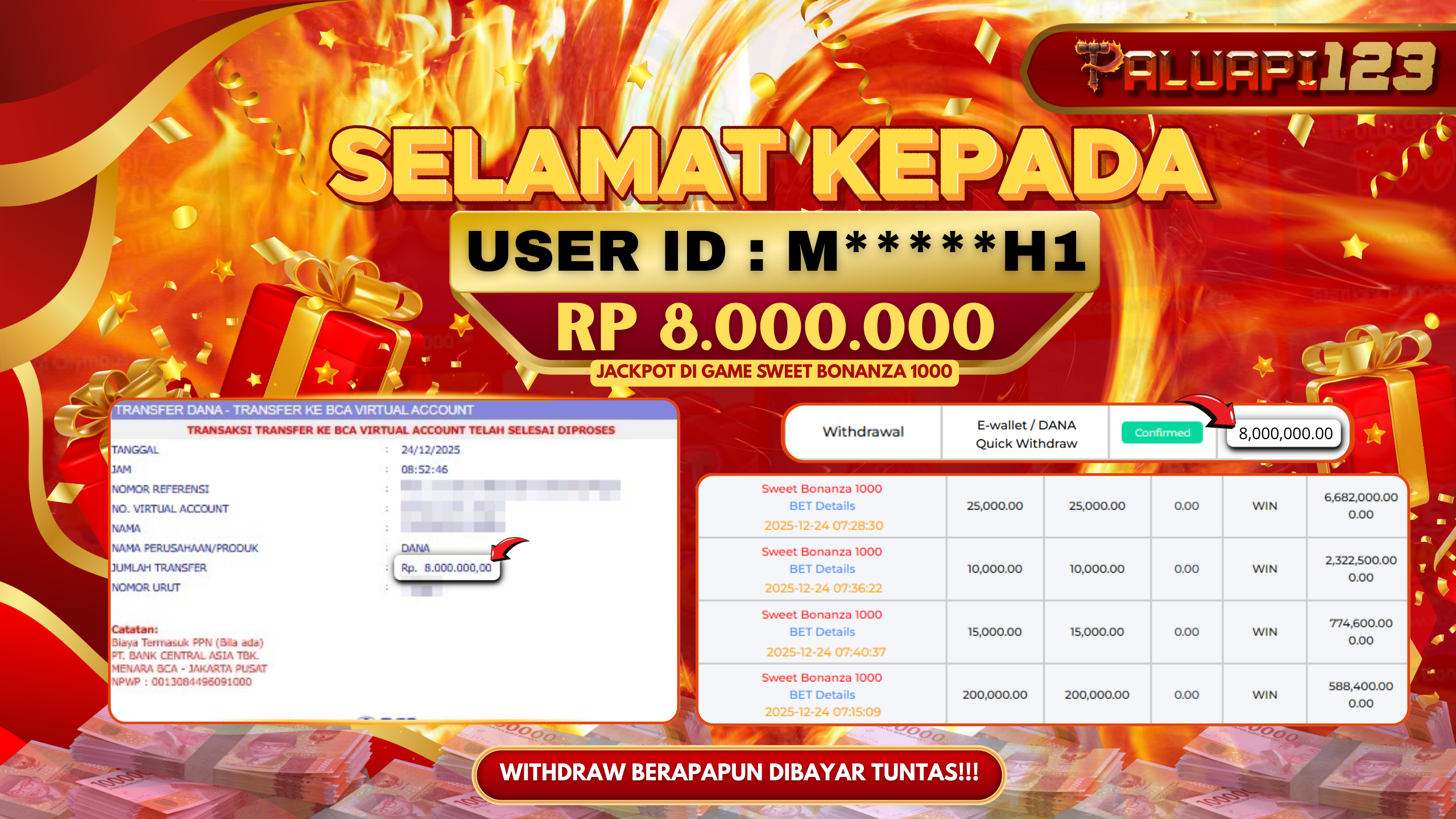 Selamat kepada User id : M*****H1 Telah berhasil mendapatkan kemenangan besar pada permainan SWEET BONANZA 1000 kemenangan Sebesar Rp.8.000.000.,-