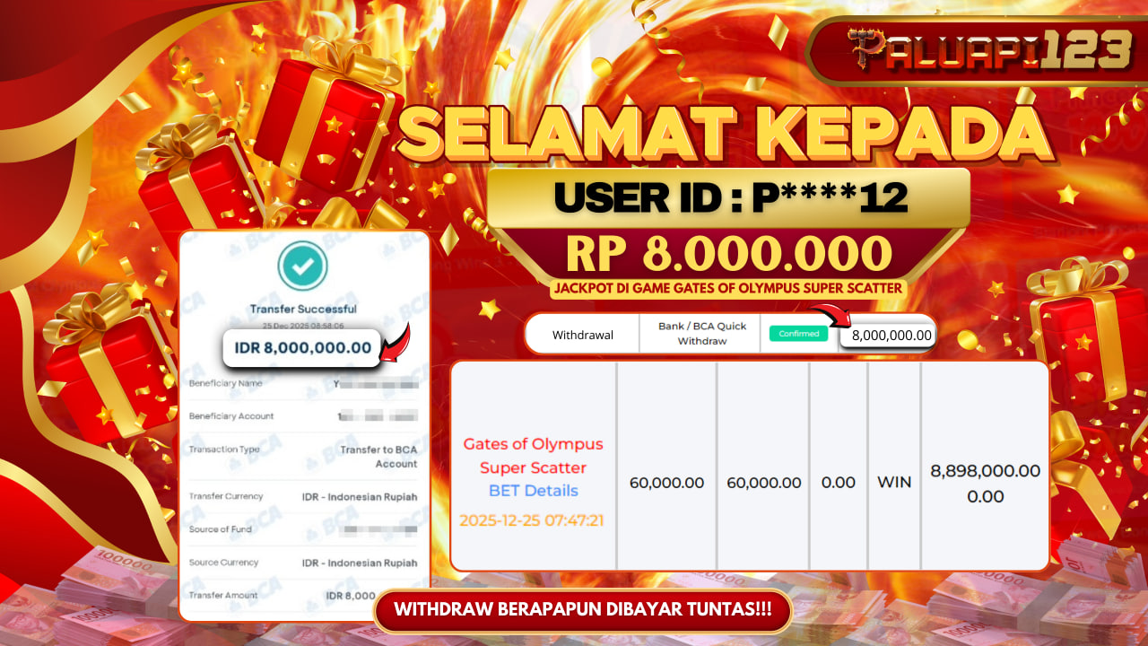 Selamat kepada User id : P****12 Telah berhasil mendapatkan kemenangan besar pada permainan GATES OF OLYMPUS SUPER SCATTER kemenangan Sebesar Rp.8.000.000.,-