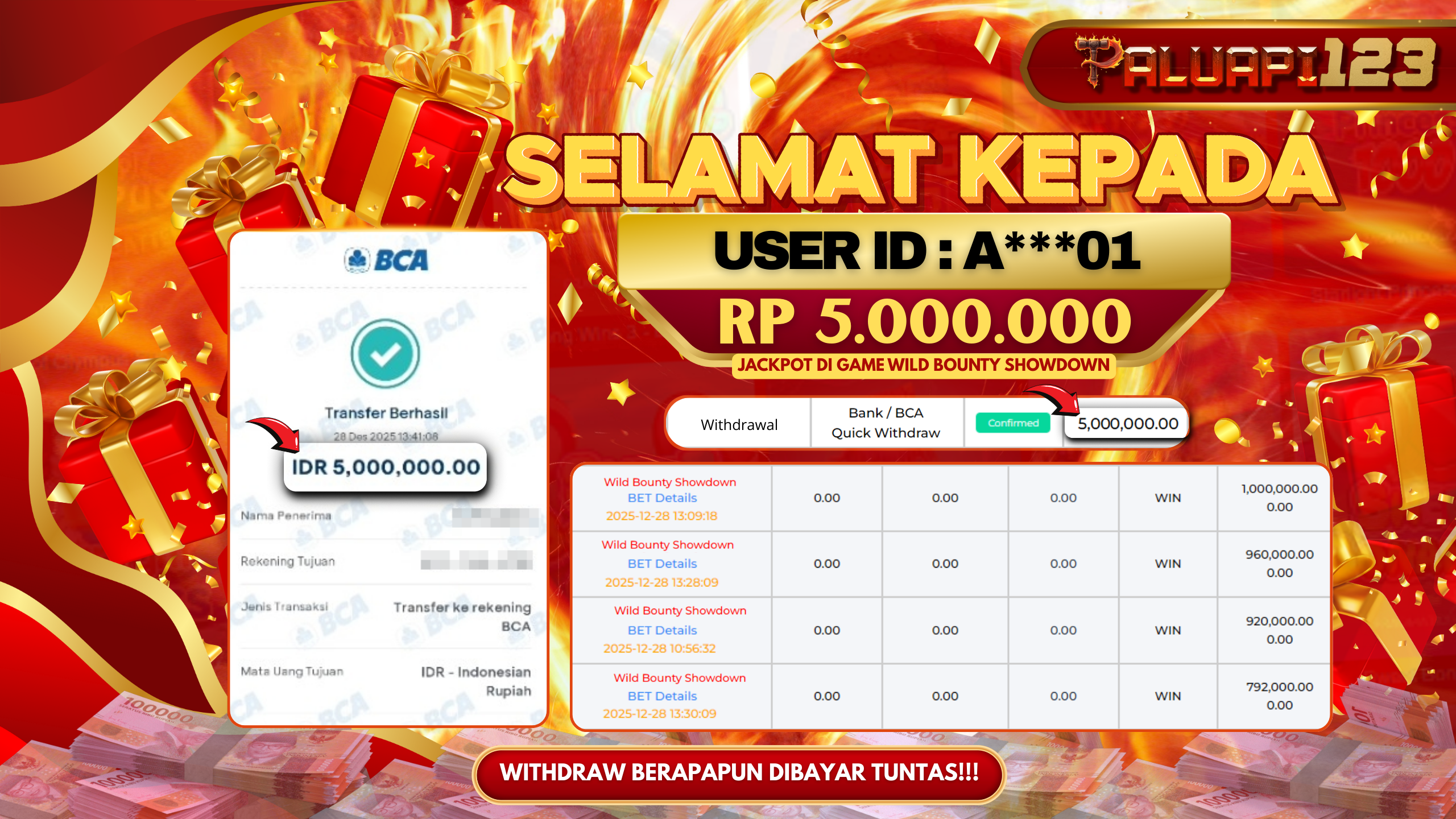 Selamat kepada User id : A***01 Telah berhasil mendapatkan kemenangan besar pada permainan WILD BOUNTY SHOW DOWN kemenangan Sebesar Rp.5.000.000.,-
