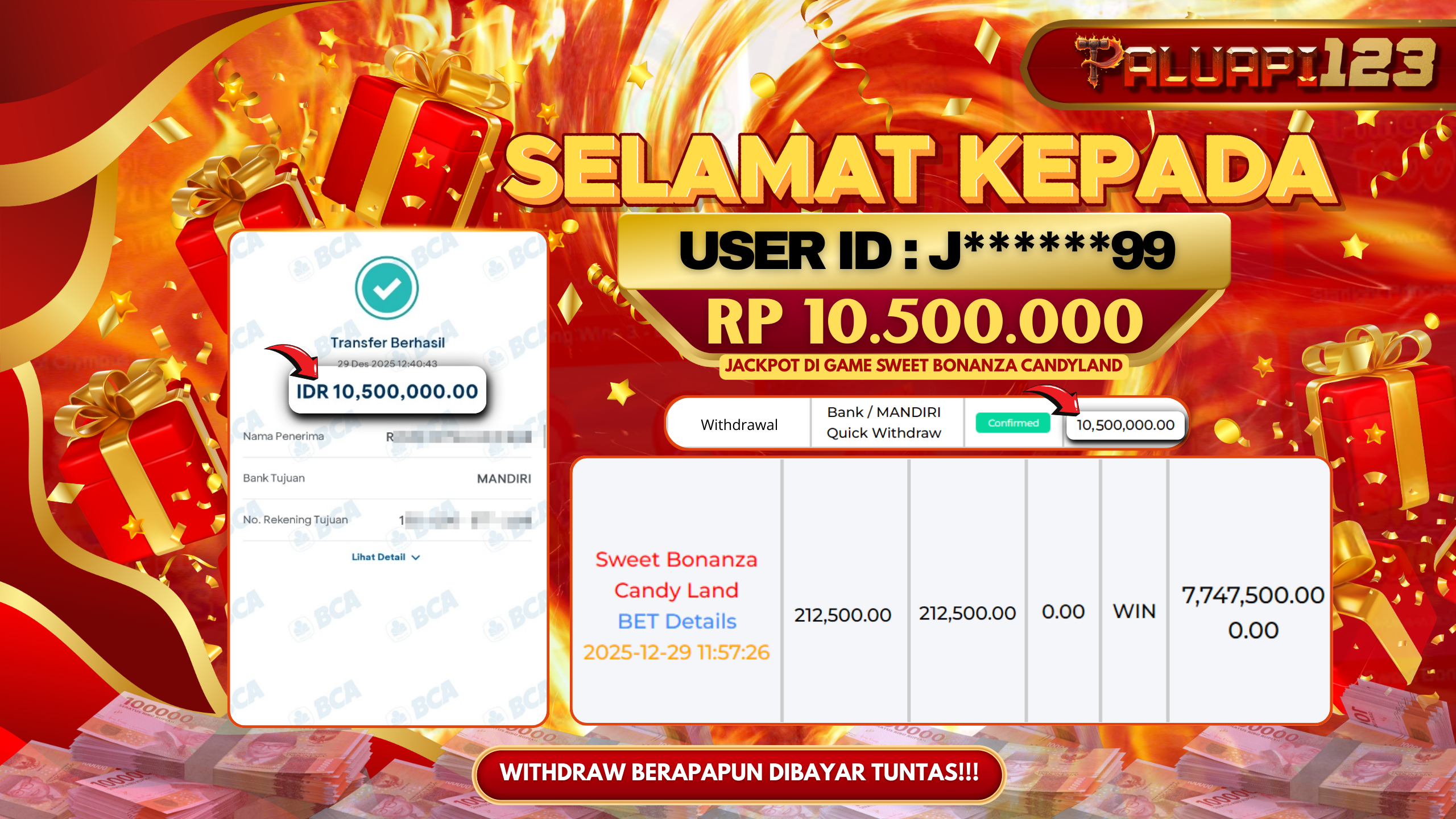 Selamat kepada User id : J******99 Telah berhasil mendapatkan kemenangan besar pada permainan SWEET BONANZA CANDYLAND kemenangan Sebesar Rp.10.500.000.,-