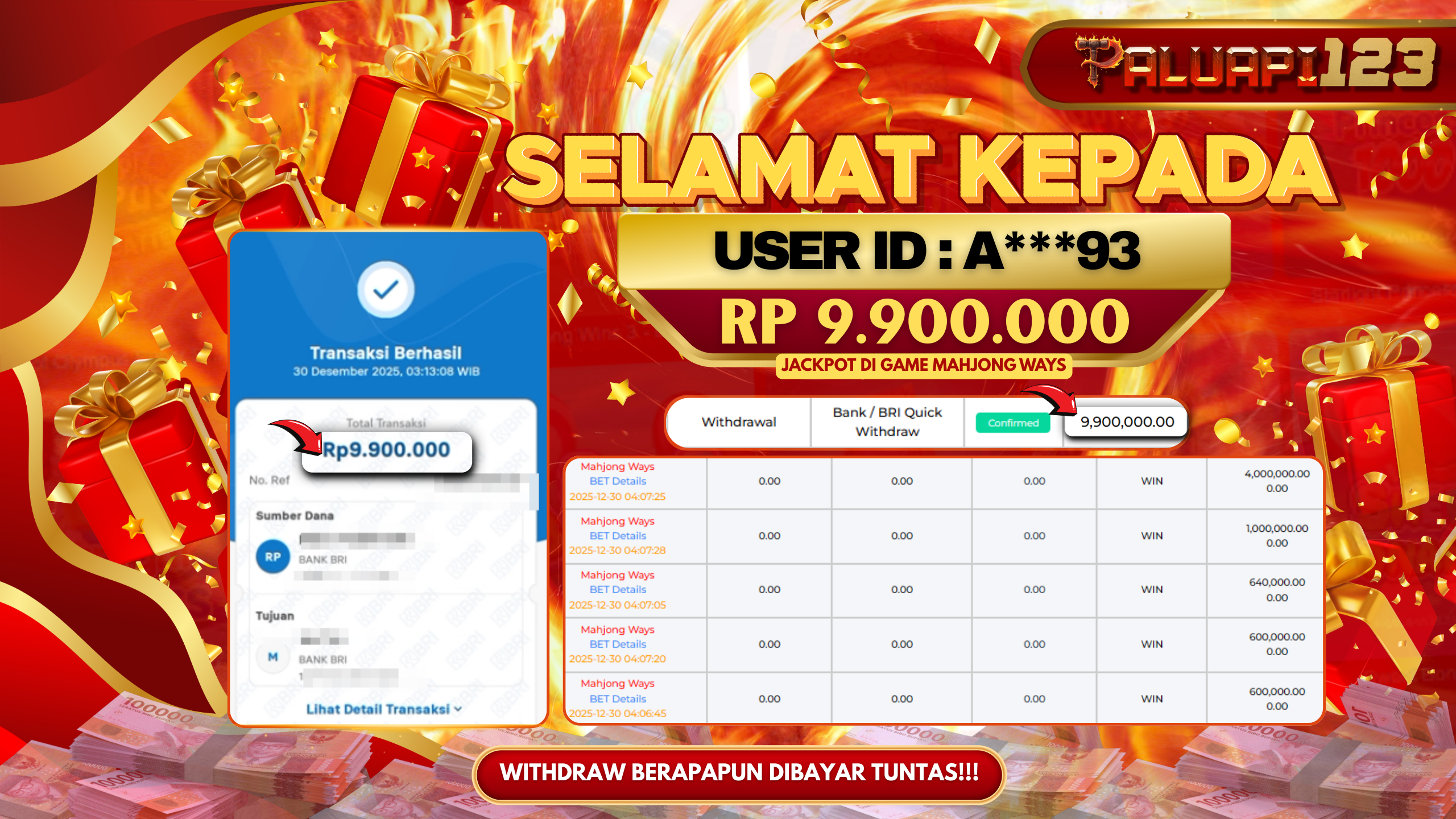 Selamat kepada User id : A***93 Telah berhasil mendapatkan kemenangan besar pada permainan MAHJONG WAYS kemenangan Sebesar Rp.9.900.000.,-