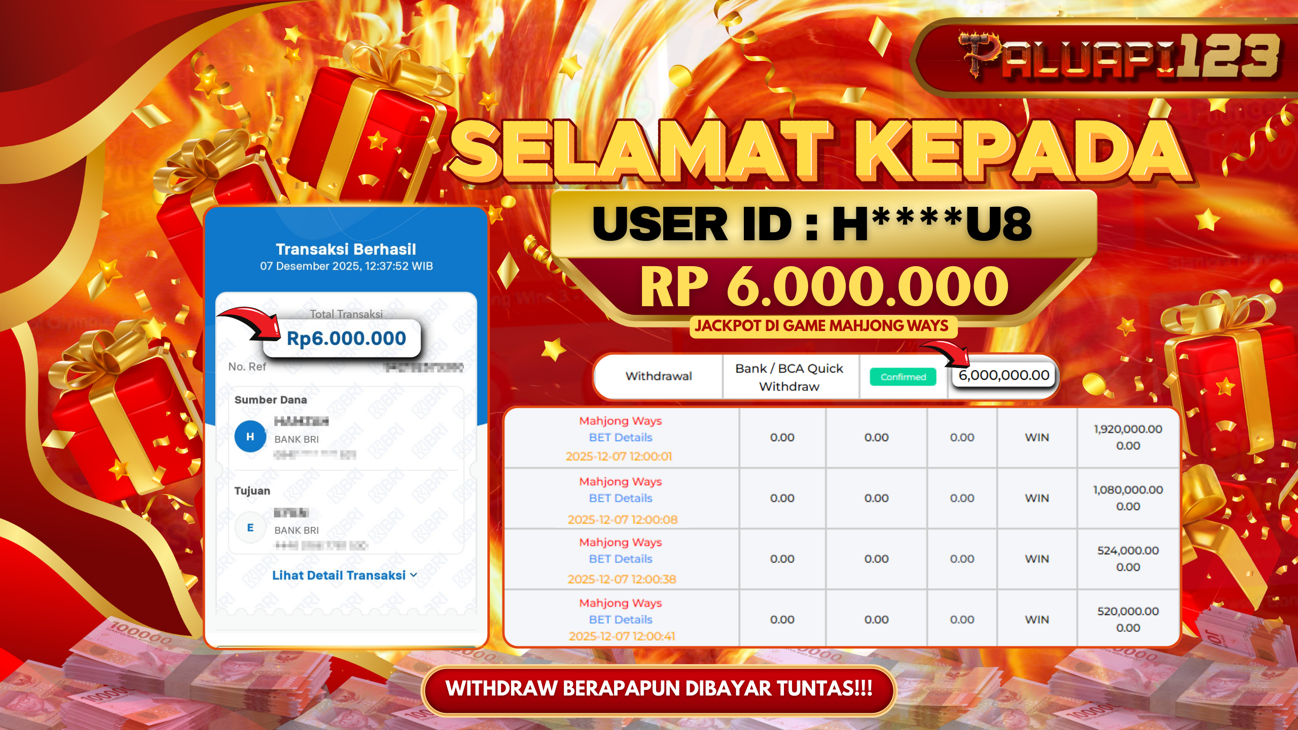 Selamat kepada User id : H****U8 Telah berhasil mendapatkan kemenangan besar pada permainan MAHJONG WAYS kemenangan Sebesar Rp.6.000.000.,-
