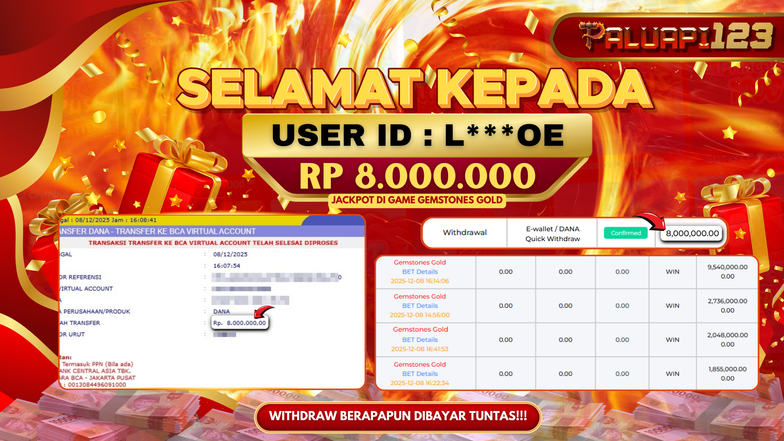 Selamat kepada User id : L***OE Telah berhasil mendapatkan kemenangan besar pada permainan GEMSTONES GOLD kemenangan Sebesar Rp.8.000.000.,-