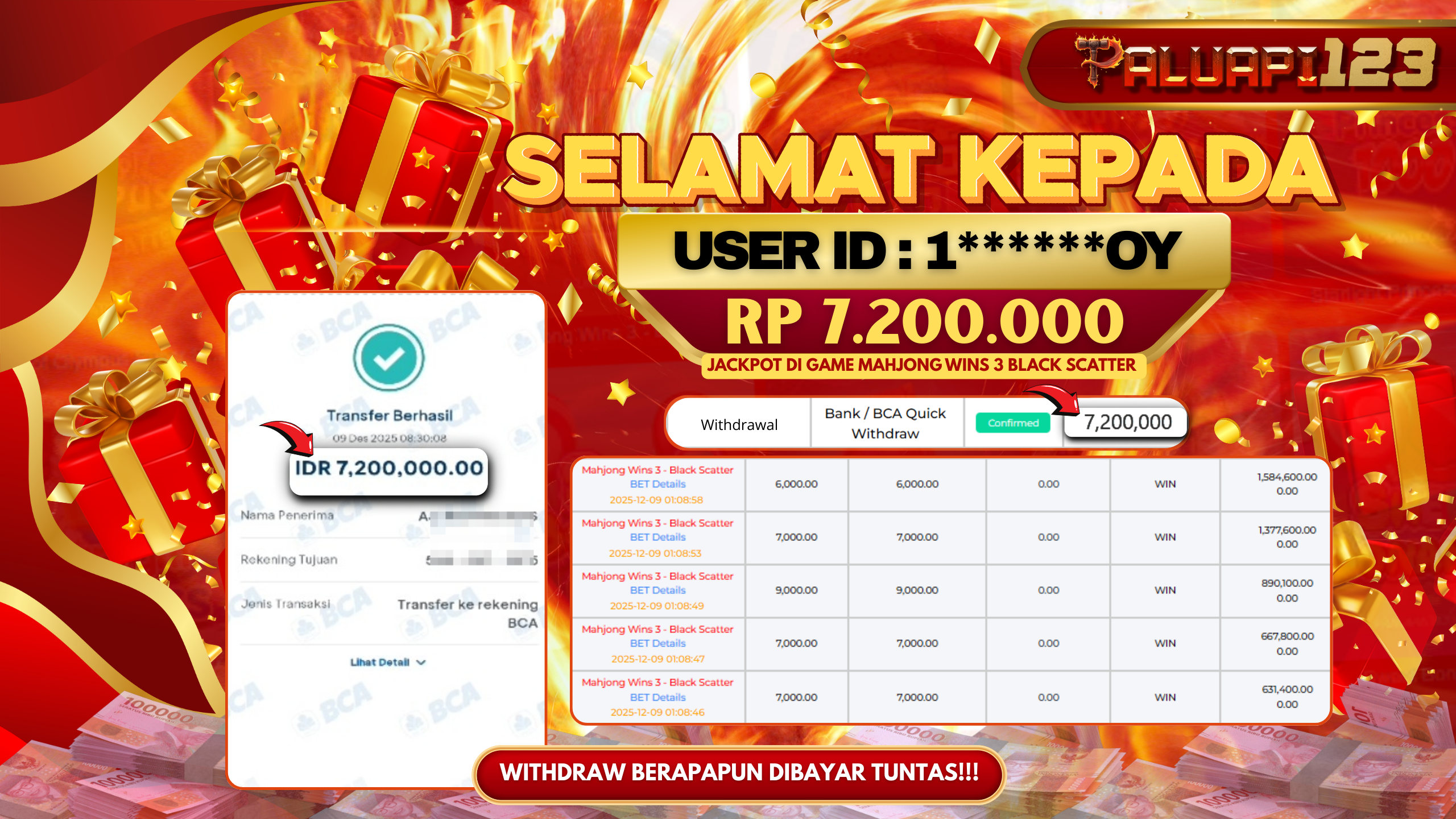 Selamat kepada User id : 1******OY Telah berhasil mendapatkan kemenangan besar pada permainan MAHJONG WINS 3 BLACK SCATTER kemenangan Sebesar Rp.7.200.000.,-