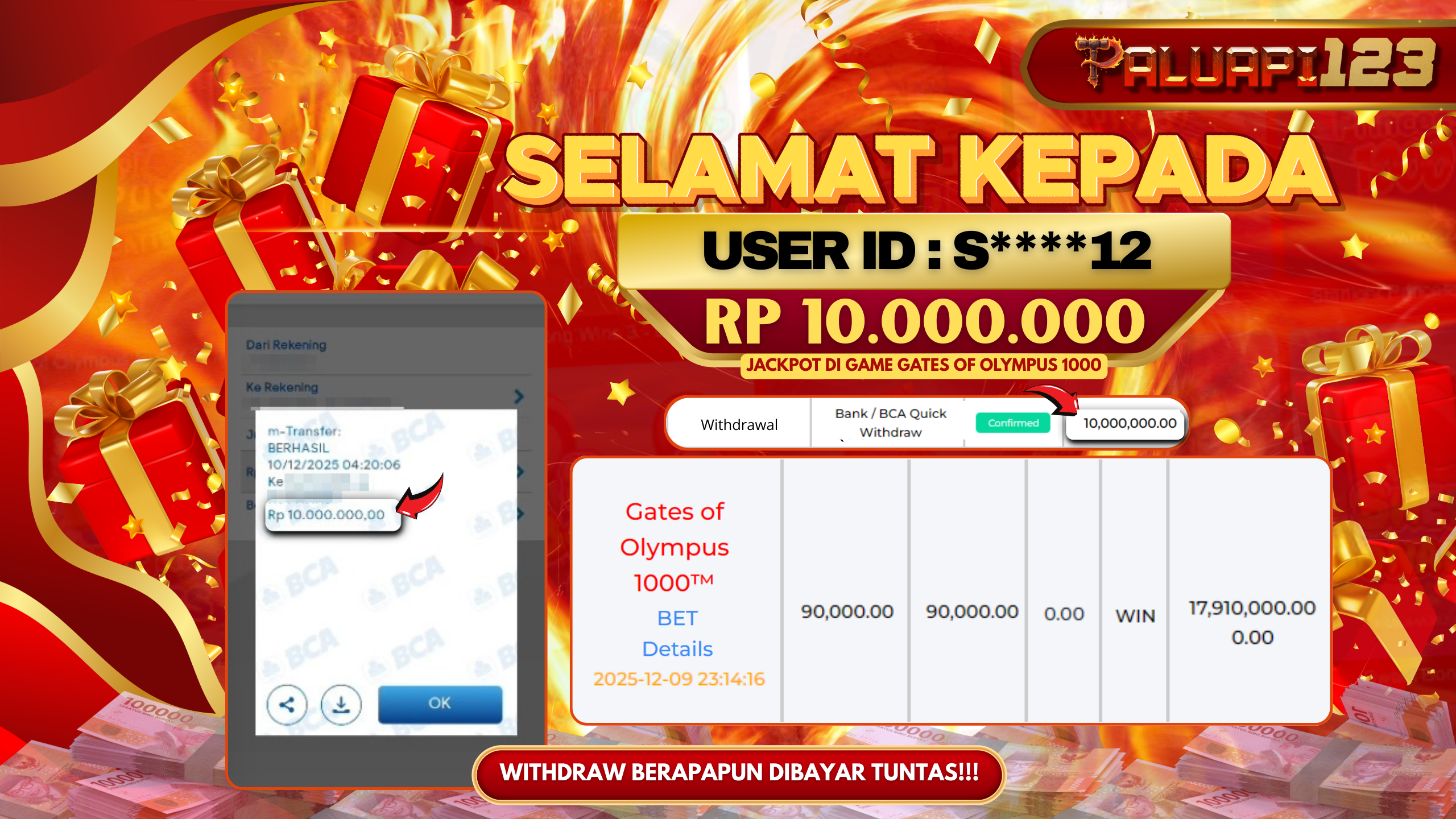 Selamat kepada User id : S****12 Telah berhasil mendapatkan kemenangan besar pada permainan GATES OF OLYMPUS 1000 kemenangan Sebesar Rp.10.000.000.,-