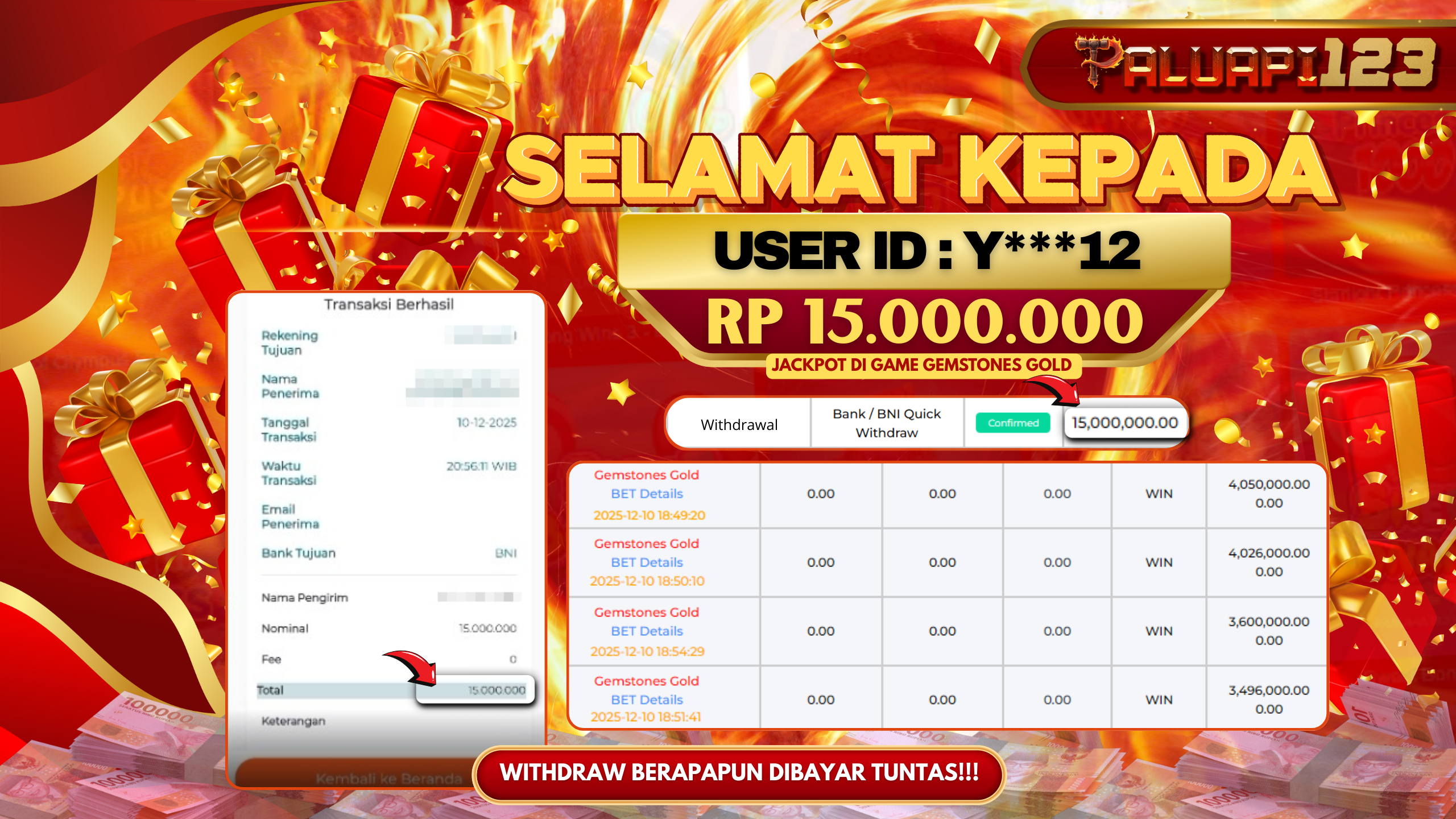 Selamat kepada User id : Y***12 Telah berhasil mendapatkan kemenangan besar pada permainan GEMSTONES GOLD kemenangan Sebesar Rp.15.000.000.,-