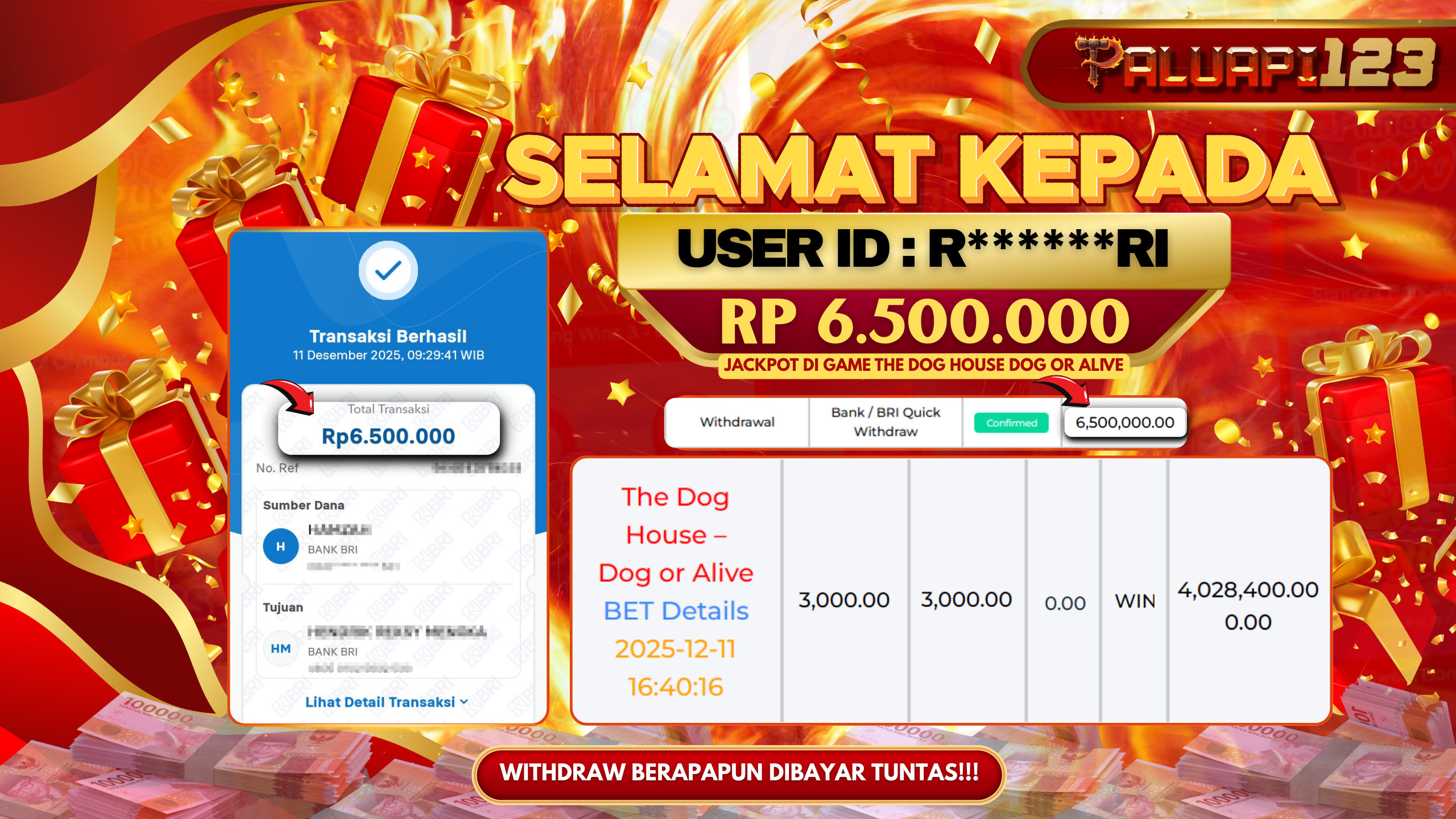 Selamat kepada User id : R******RI Telah berhasil mendapatkan kemenangan besar pada permainan THE DOG HOUSE DOG OR ALIVE kemenangan Sebesar Rp.6.500.000.,-