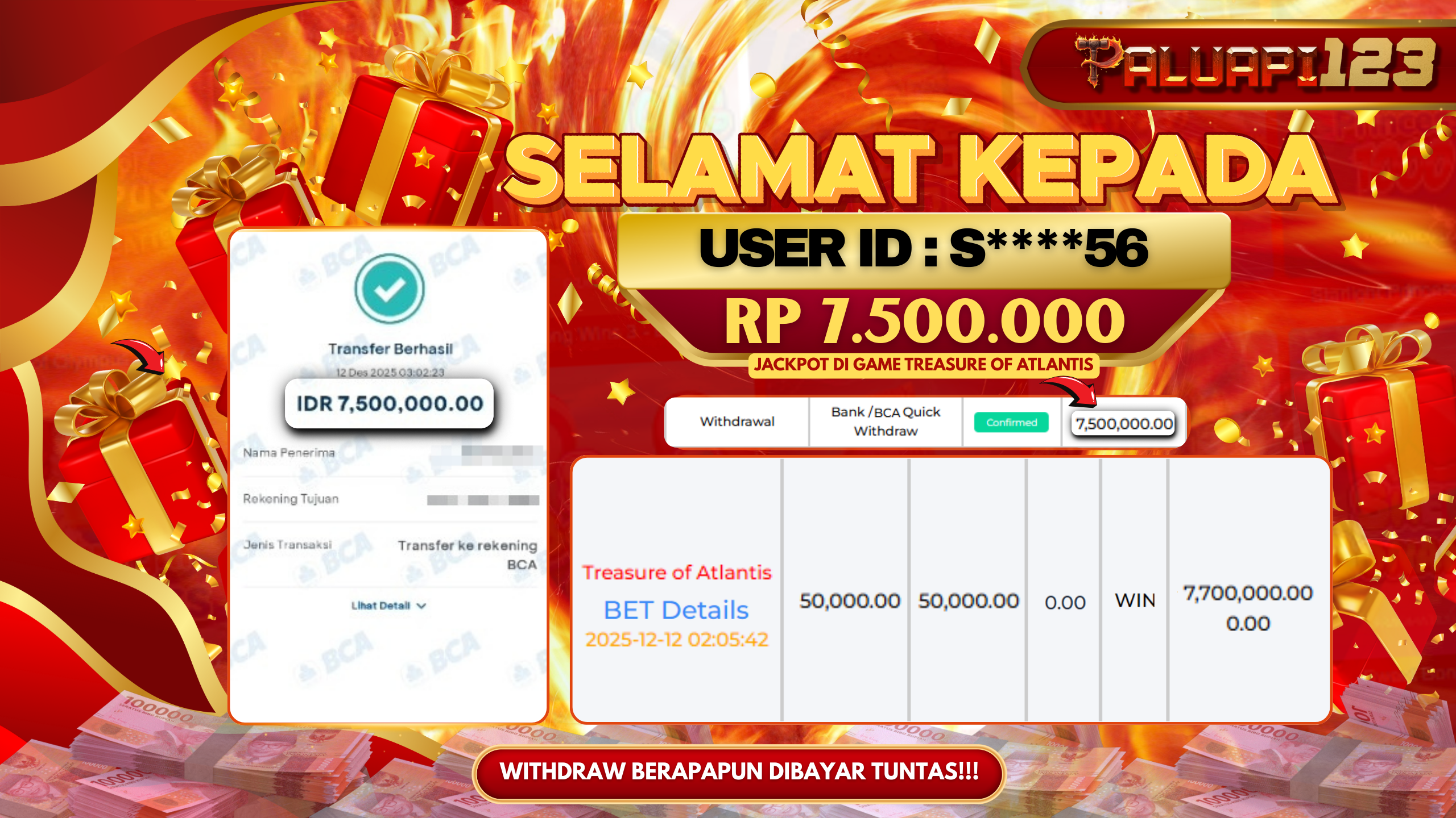 Selamat kepada User id : S*****56 Telah berhasil mendapatkan kemenangan besar pada permainan TREASURE OF ATLANTIS kemenangan Sebesar Rp.7.500.000.,-