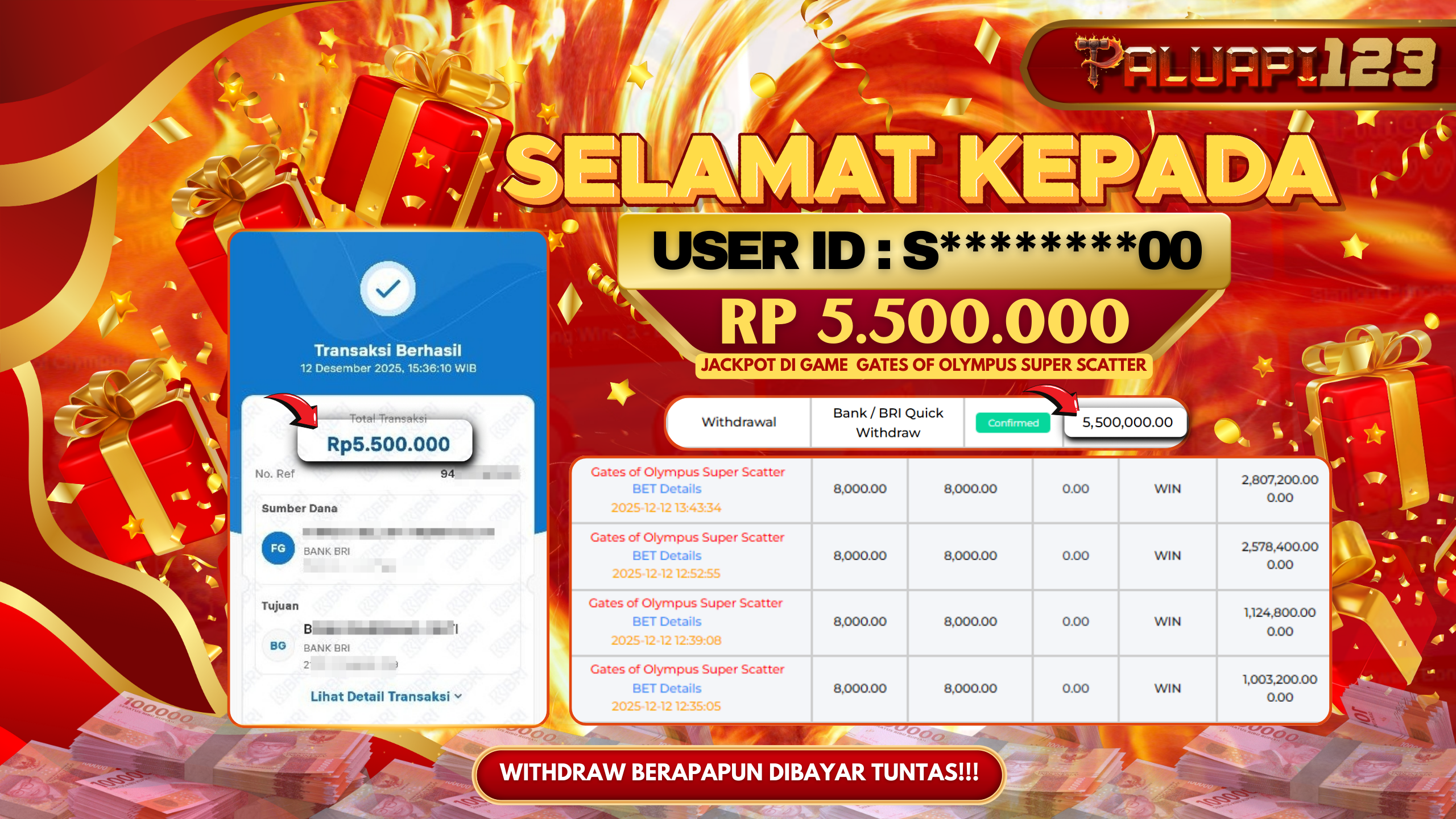 Selamat kepada User id : S********00 Telah berhasil mendapatkan kemenangan besar pada permainan GATES OF OLYMPUS SUPER SCATTER kemenangan Sebesar Rp.5.500.000.,-