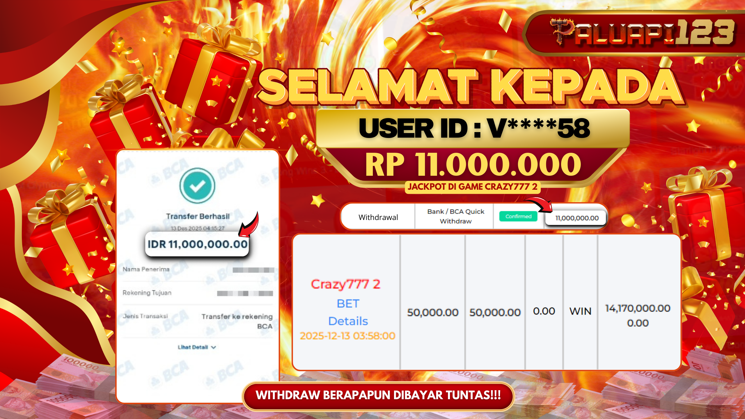 Selamat kepada User id : V****58 Telah berhasil mendapatkan kemenangan besar pada permainan CRAZY777 2 kemenangan Sebesar Rp.11.000.000.,-