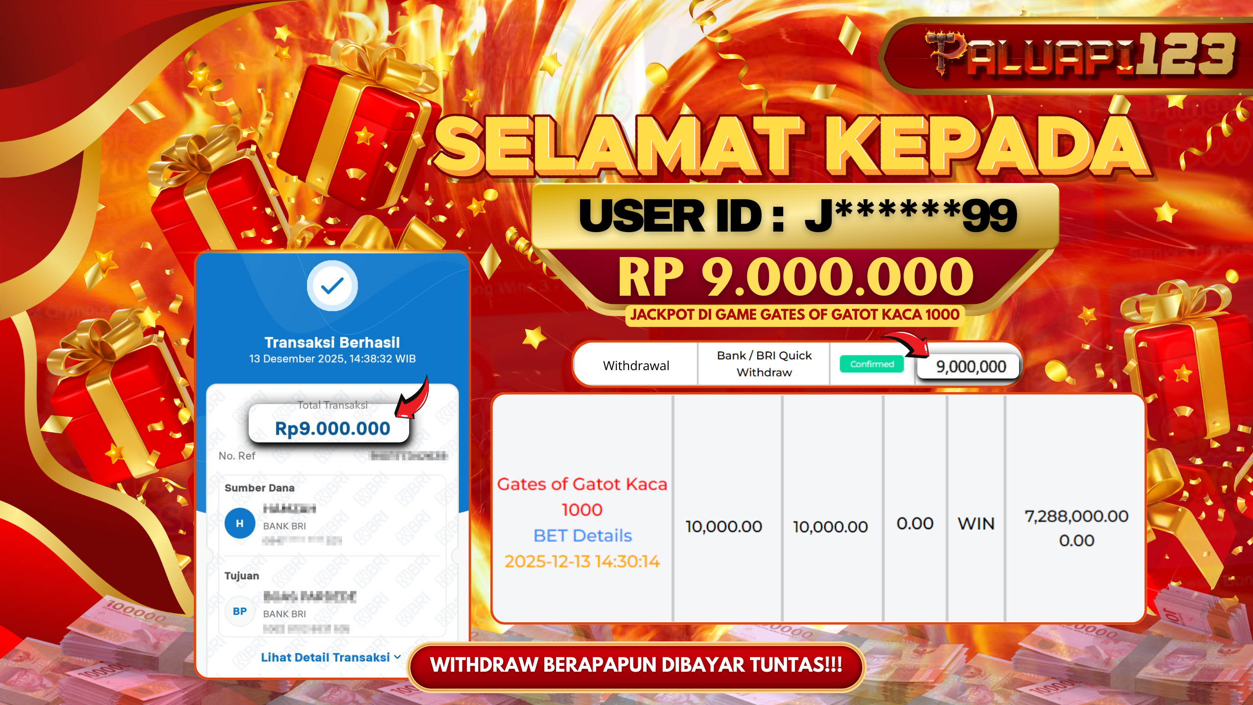 Selamat kepada User id : J******99 Telah berhasil mendapatkan kemenangan besar pada permainan GATES OF GATOT KACA 1000 kemenangan Sebesar Rp.9.000.000.,-