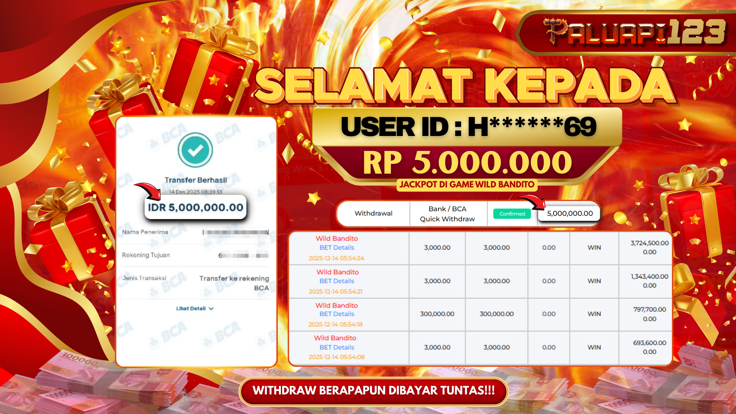 Selamat kepada User id : H******69 Telah berhasil mendapatkan kemenangan besar pada permainan WILD BANDITO kemenangan Sebesar Rp.5.000.000.,-