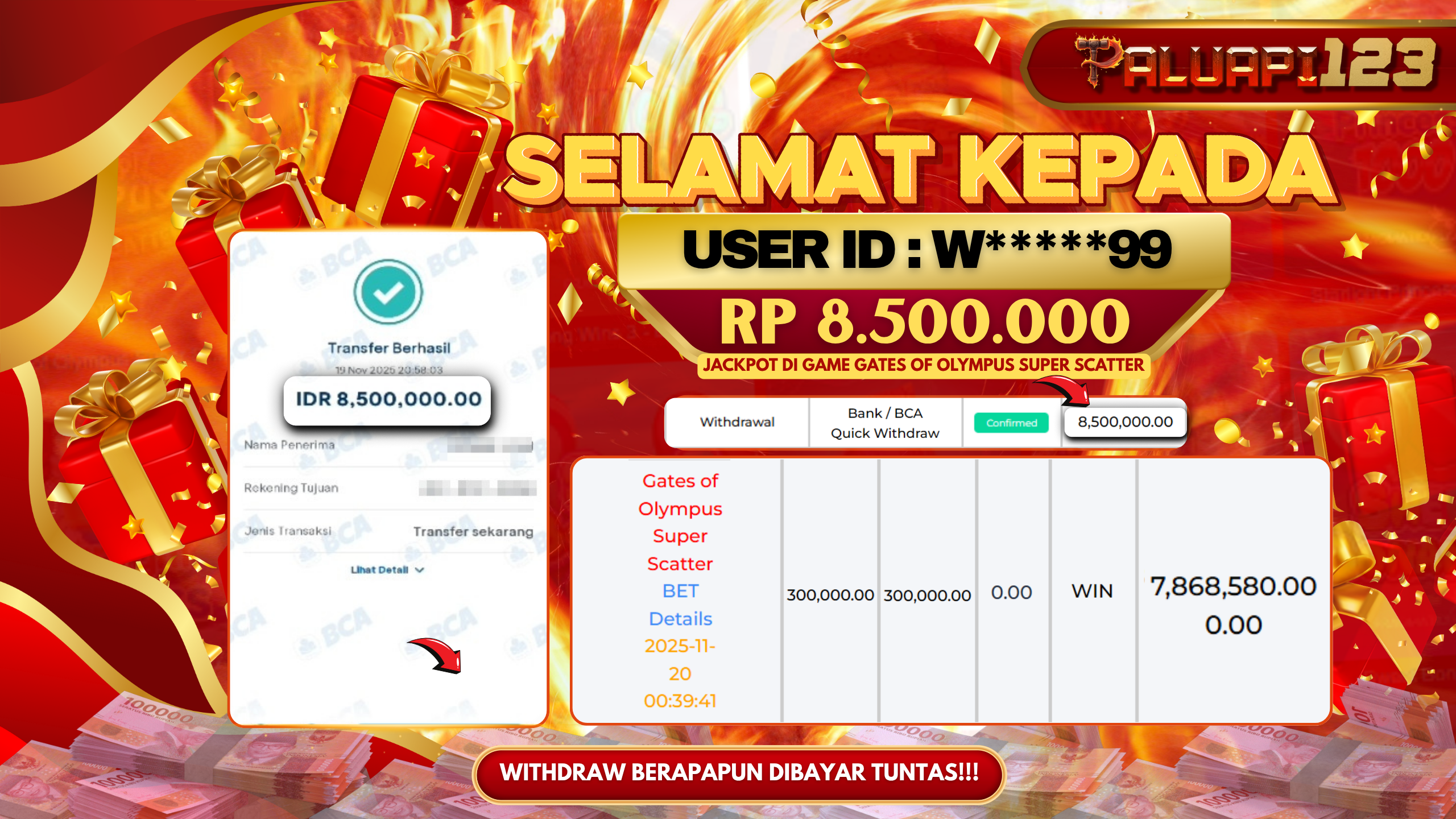 Selamat kepada User id : W*****99 Telah berhasil mendapatkan kemenangan besar pada permainan GATES OF OLYMPUS SUPER SCATTER kemenangan Sebesar Rp.8.500.000.,-