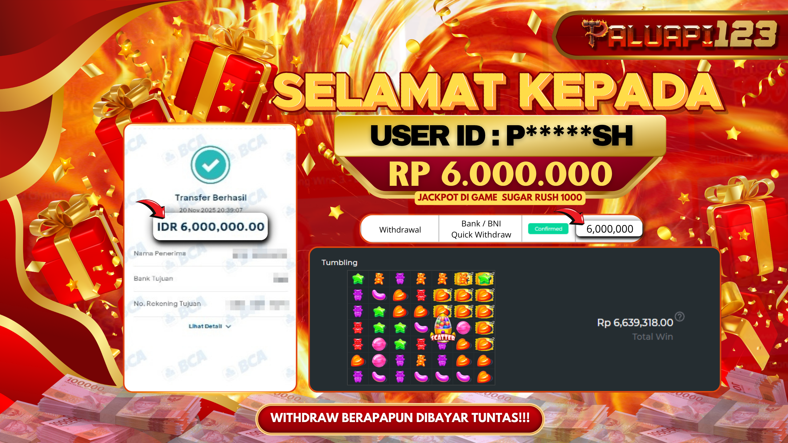 Selamat kepada User id : P*****SH Telah berhasil mendapatkan kemenangan besar pada permainan SUGAR RUSH 1000 kemenangan Sebesar Rp.6.000.000.,-