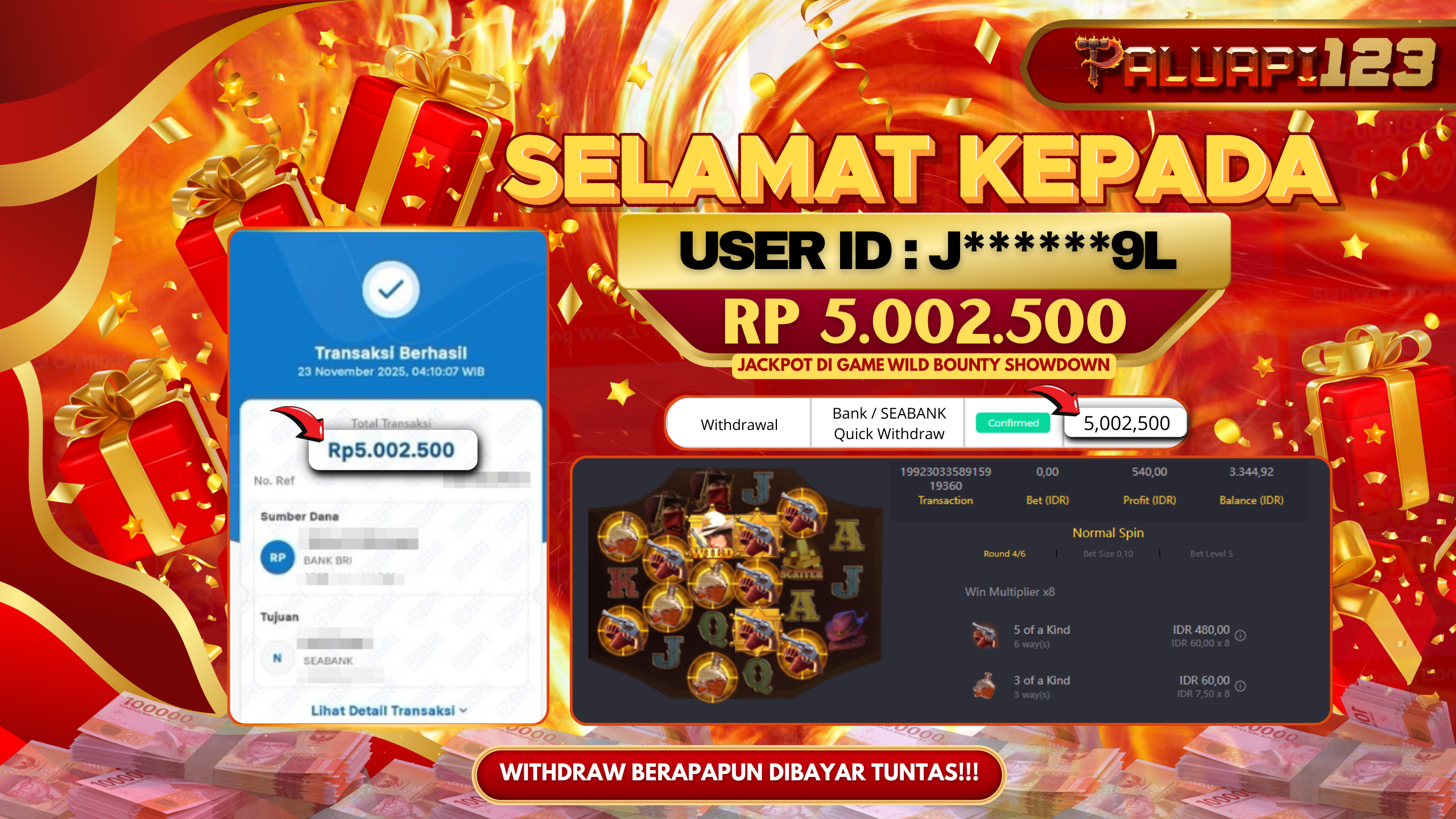 Selamat kepada User id : J******9L Telah berhasil mendapatkan kemenangan besar pada permainan WILD BOUNTY SHOWDOWN kemenangan Sebesar Rp.5.002.500.,-