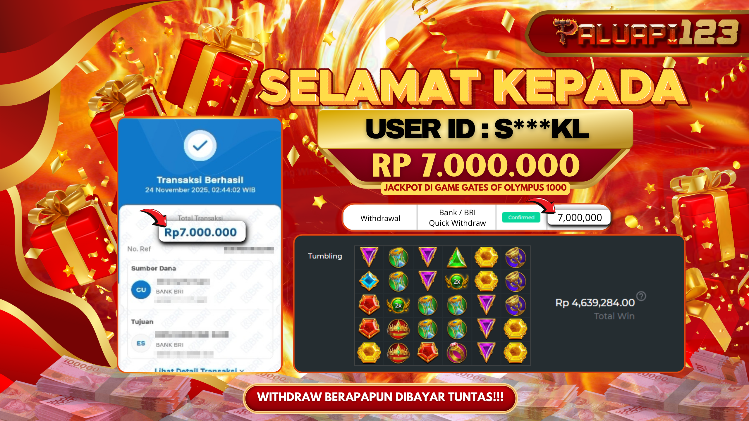 Selamat kepada User id : S***KL Telah berhasil mendapatkan kemenangan besar pada permainan GATES OF OLYMPUS 1000 kemenangan Sebesar Rp.7.000.000.,-