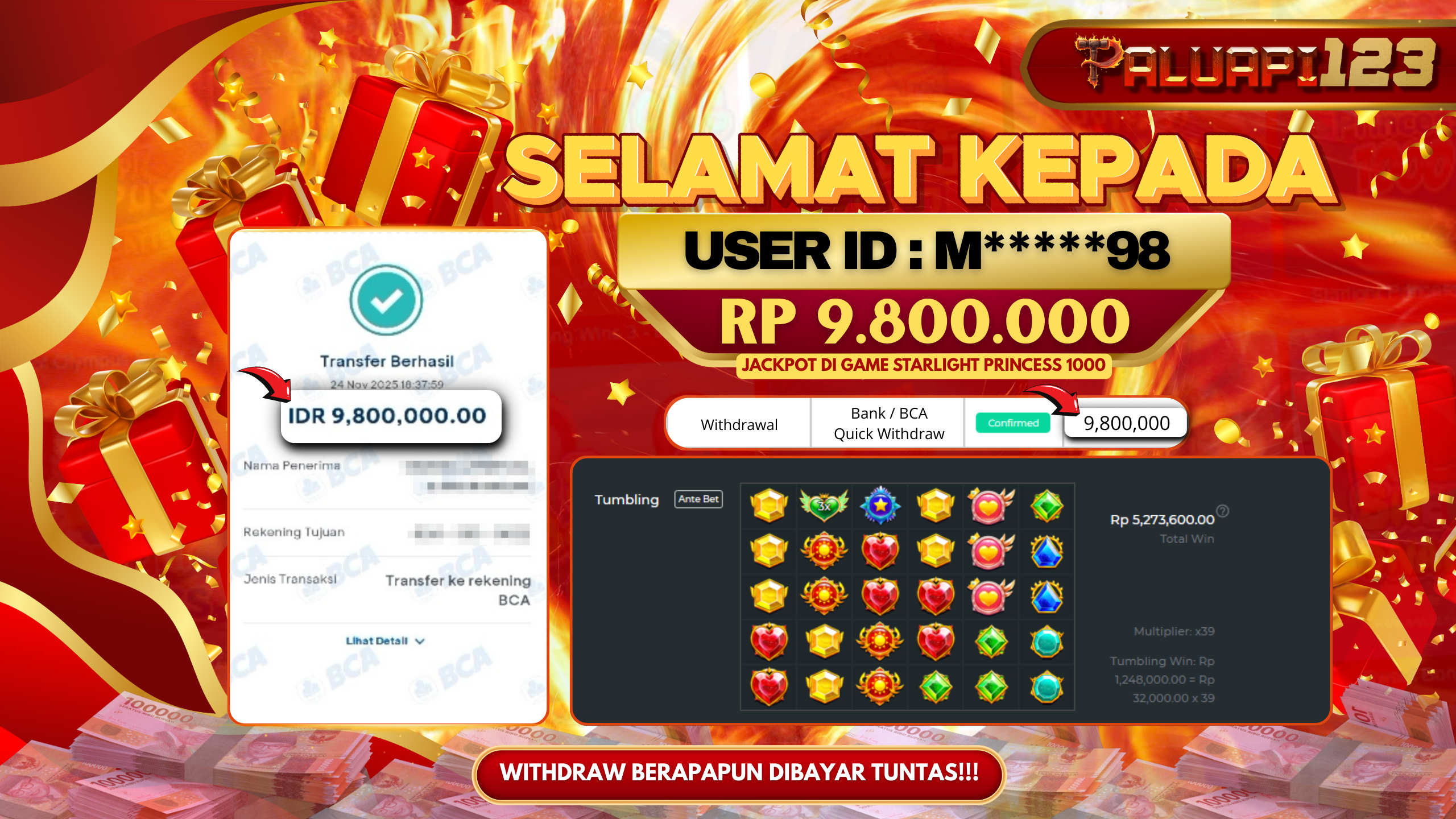 Selamat kepada User id : M*****98 Telah berhasil mendapatkan kemenangan besar pada permainan STARLIGHT PRINCESS 1000 kemenangan Sebesar Rp.9.800.000.,-