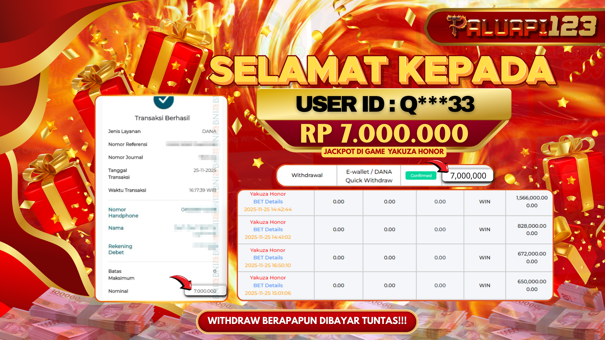 Selamat kepada User id : Q***33 Telah berhasil mendapatkan kemenangan besar pada permainan YAKUZA HONOR kemenangan Sebesar Rp.7.000.000.,-
