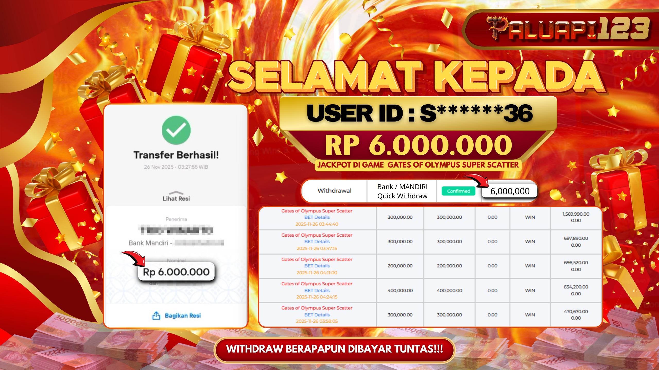 Selamat kepada User id : S******36 Telah berhasil mendapatkan kemenangan besar pada permainan GATES OF OLYMPUS SUPER SCATTER kemenangan Sebesar Rp.6.000.000.,-