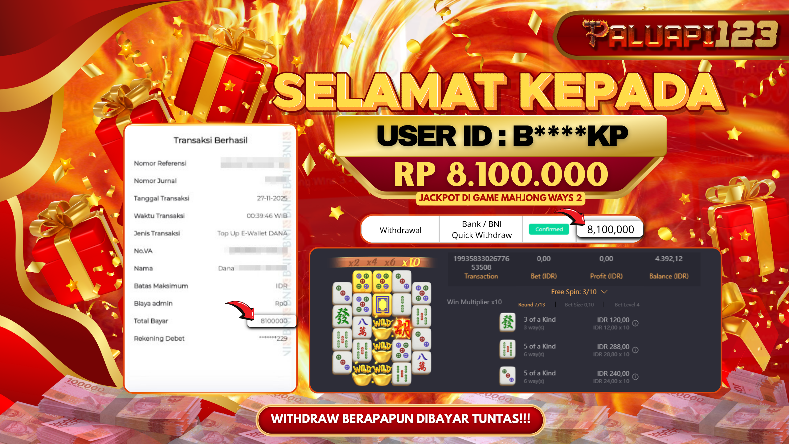 Selamat kepada User id : B****KP Telah berhasil mendapatkan kemenangan besar pada permainan MAHJONG WAYS 2 kemenangan Sebesar Rp.8.100.000.,-