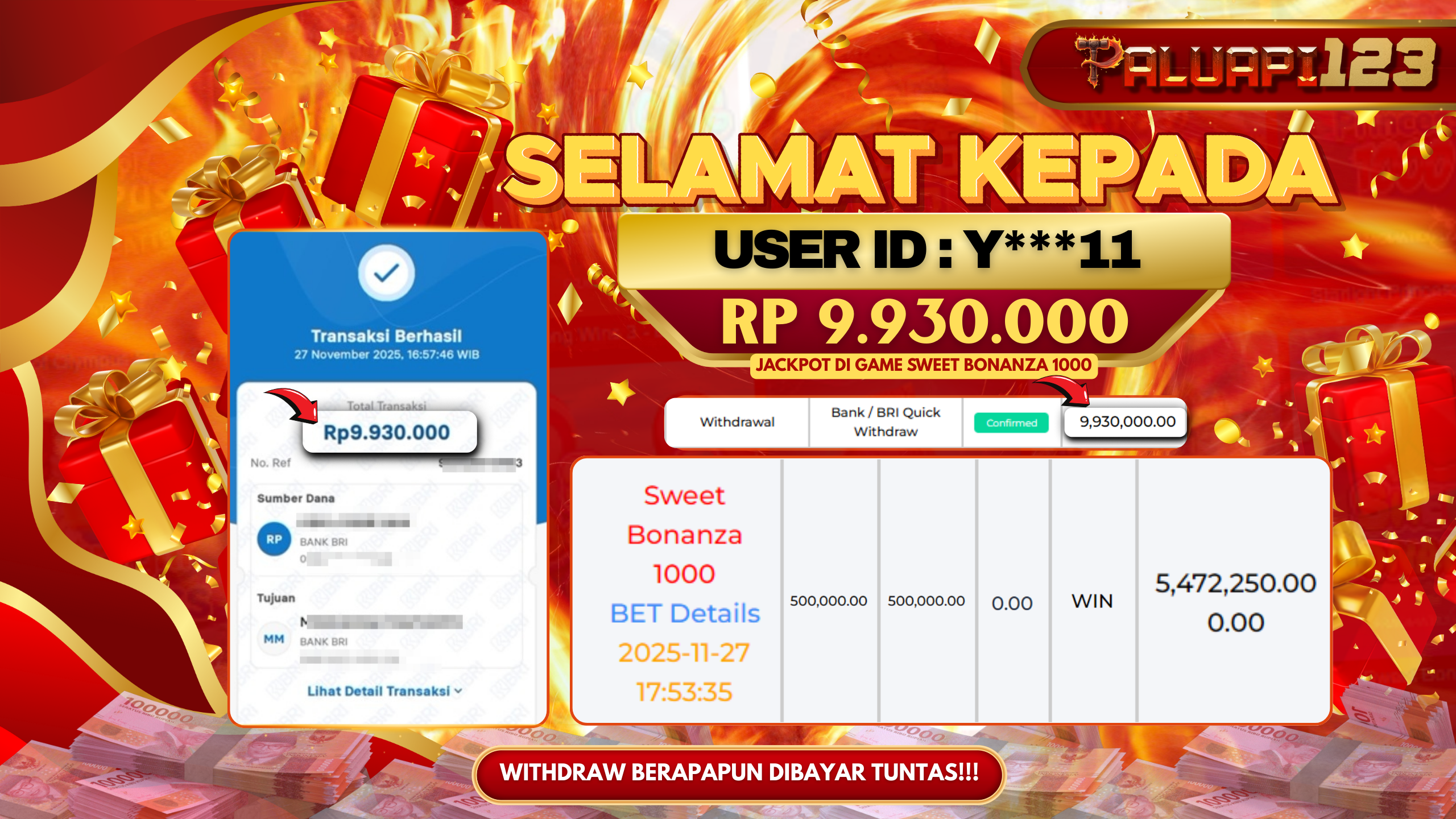 Selamat kepada User id : Y***11 Telah berhasil mendapatkan kemenangan besar pada permainan SWEET BONANZA 1000 kemenangan Sebesar Rp.9.930.000.,-