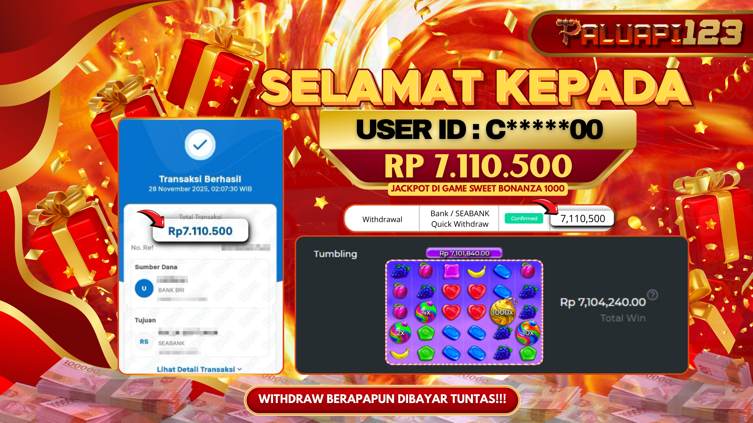 Selamat kepada User id : C*****00 Telah berhasil mendapatkan kemenangan besar pada permainan SWEET BONANZA 1000 kemenangan Sebesar Rp.7.110.500.,-
