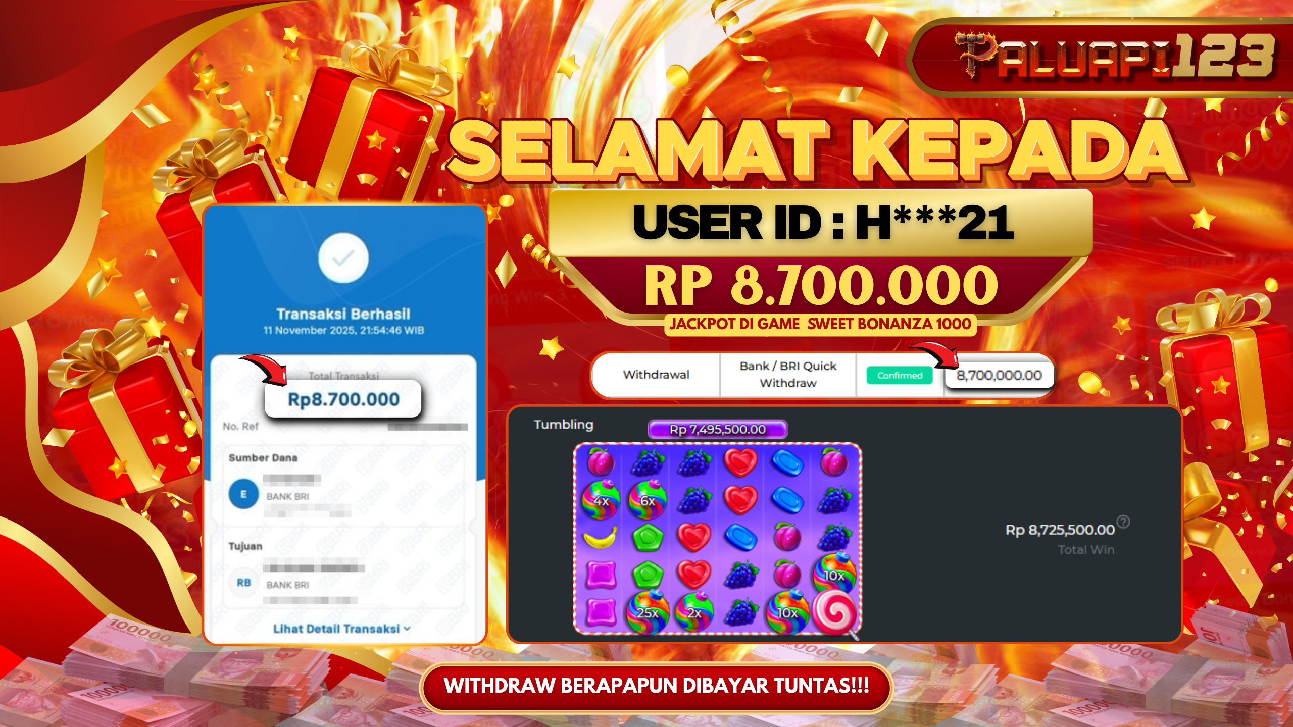 Selamat kepada User id : H***21 Telah berhasil mendapatkan kemenangan besar pada permainan SLOT SWEET BONANZA 1000 kemenangan Sebesar Rp.8.700.000.,-