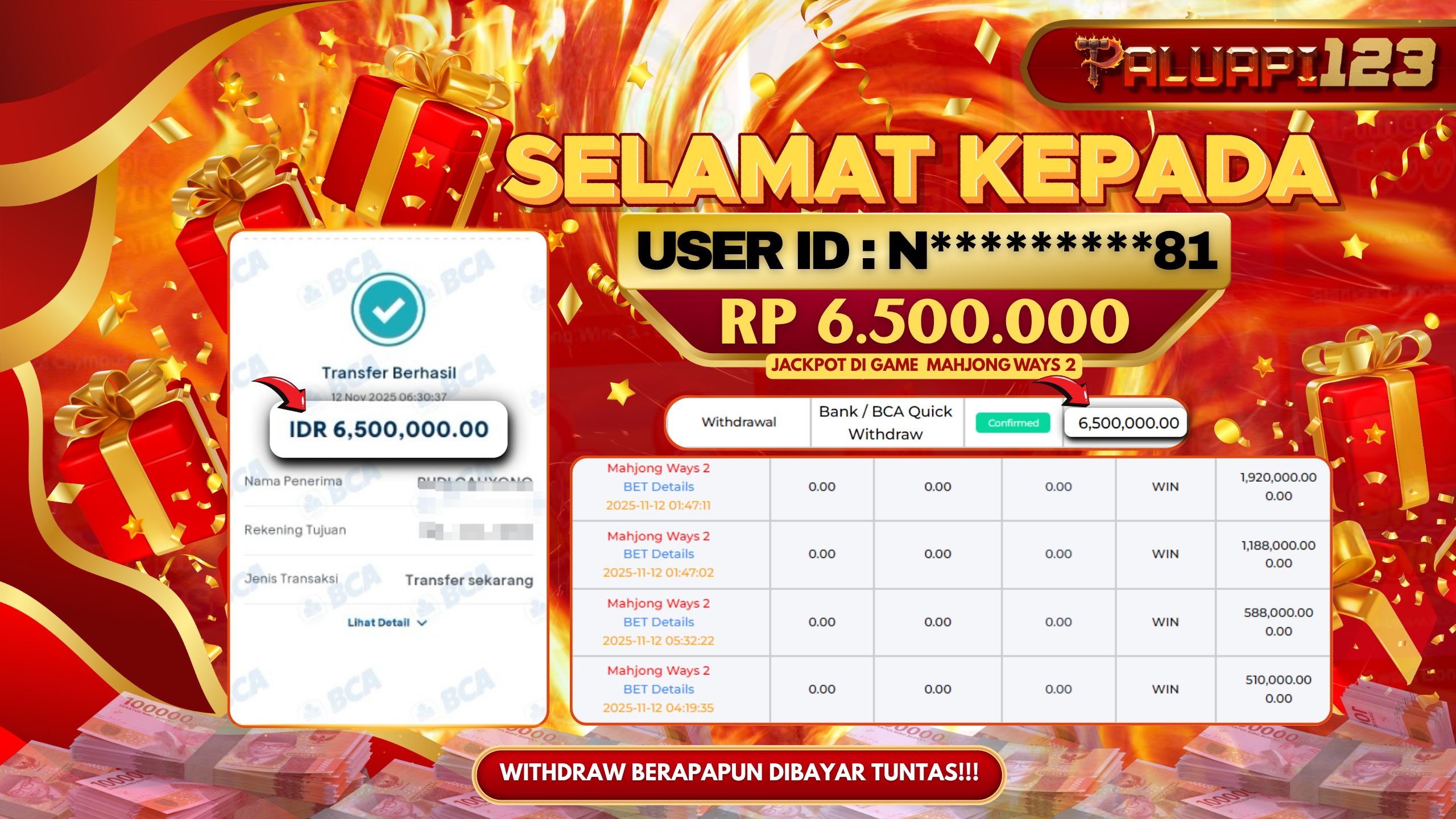 Selamat kepada User id : N*********81 Telah berhasil mendapatkan kemenangan besar pada permainan MAHJONG WAYS 2 kemenangan Sebesar Rp.6.500.000.,-