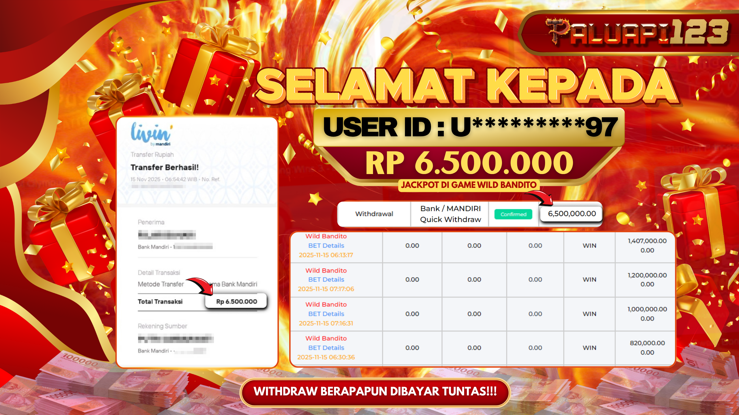 Selamat kepada User id : U*********97 Telah berhasil mendapatkan kemenangan besar pada permainan WILD BANDITO kemenangan Sebesar Rp.6.500.000.,-