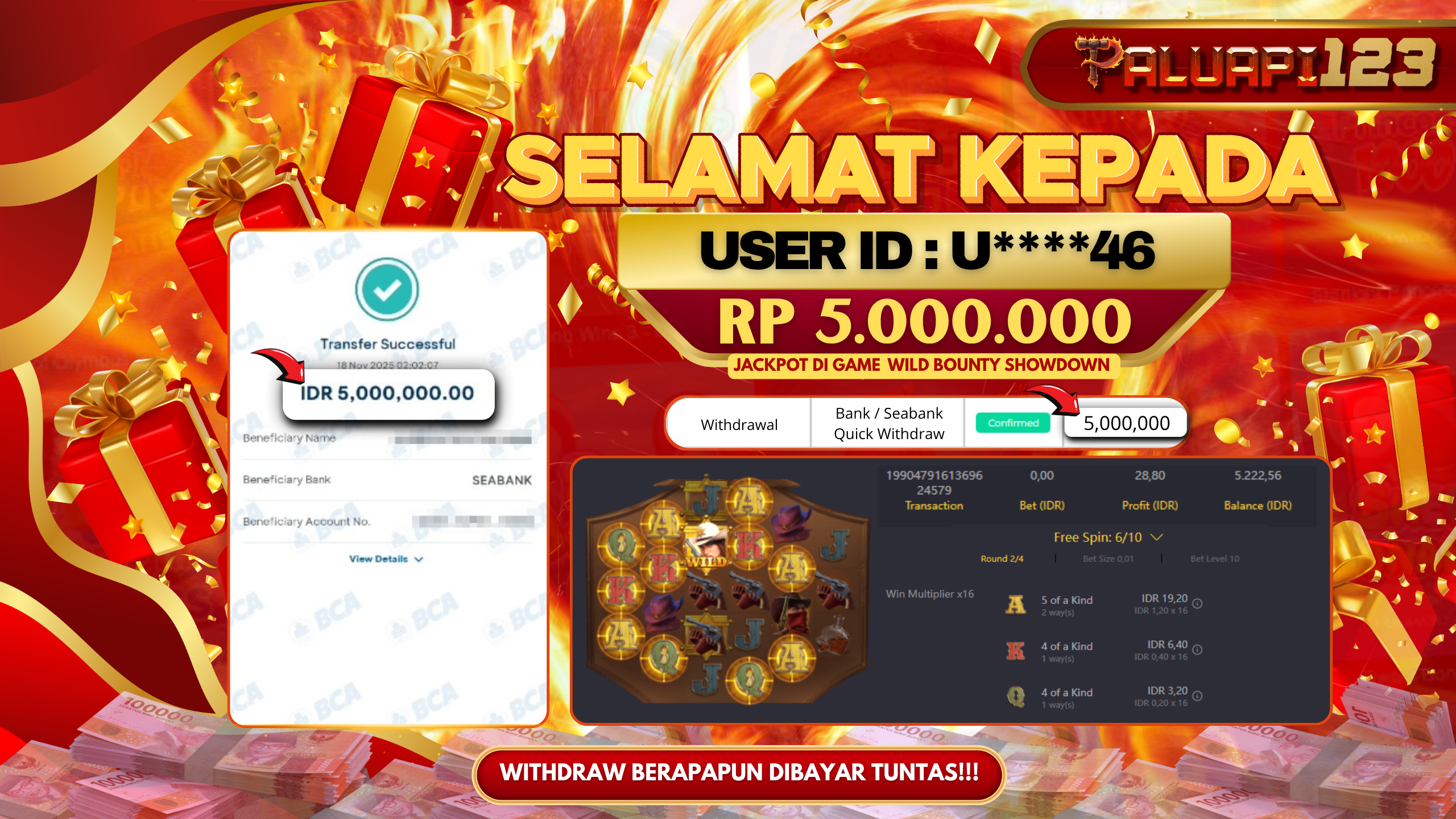 Selamat kepada User id : U****46 Telah berhasil mendapatkan kemenangan besar pada permainan WILD BOUNTY SHOWDOWN kemenangan Sebesar Rp.5.000.000.,-